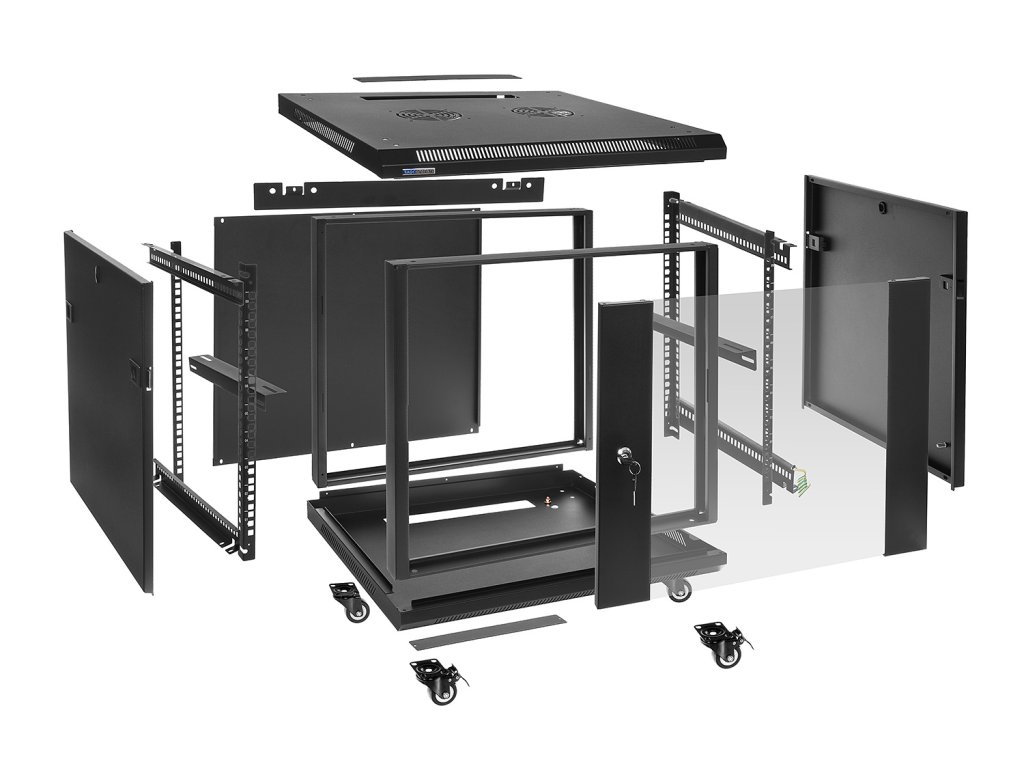Přední dveře jsou vyrobeny z tvrzeného skla, které zvyšují jeho mechanickou pevnost a tepelnou stabilitu. Zbytek stěn jsou vyrobeny z barevně lakovaného plechu, takže je odolný vůči korozi, oxidaci a odstranění barvy. Boční stěny mohou být odstraněny (zacvakávání), což vznikne ještě větší přístup k zařízení. Mohou být také uzamčeny, což zvyšuje bezpečnost zařízení instalovaných v rozvaděči. Je zde také možnost odemikání a zamikání na klíč zadních dveří. Pojízdná racková skříň je navržen tak, aby dveře bylo možné namontovat vlevo nebo vpravo. Ve skříni existují různé možnosti pro vstup kabelů (nahoře, dole).