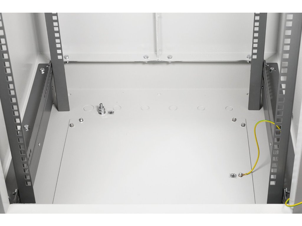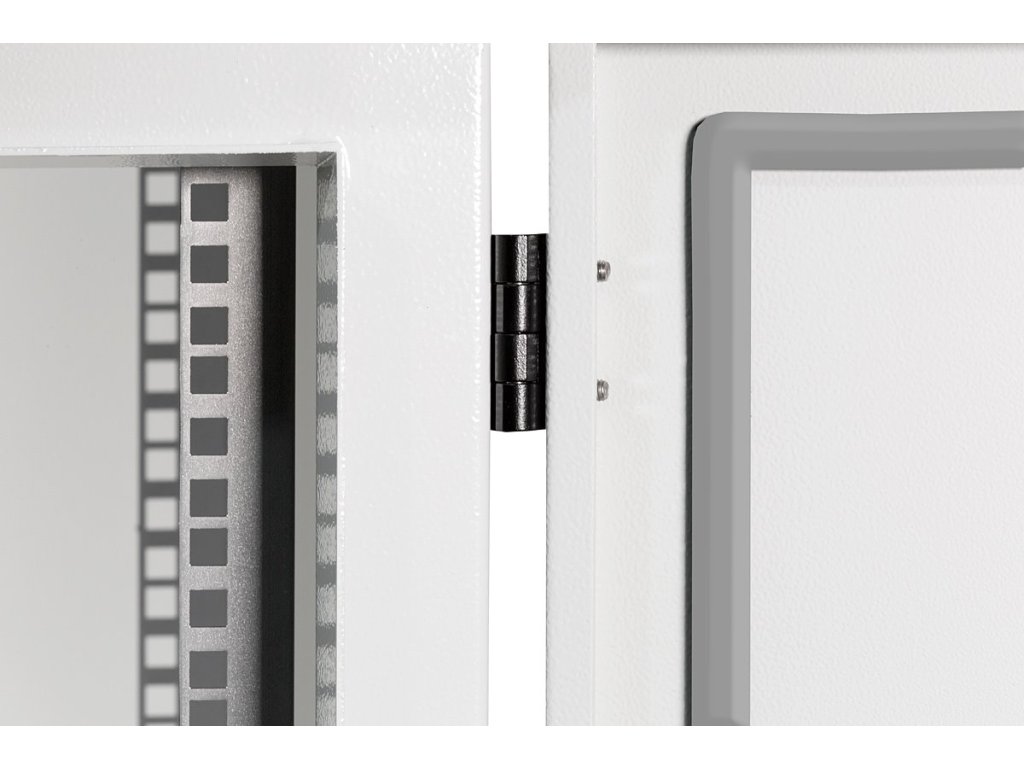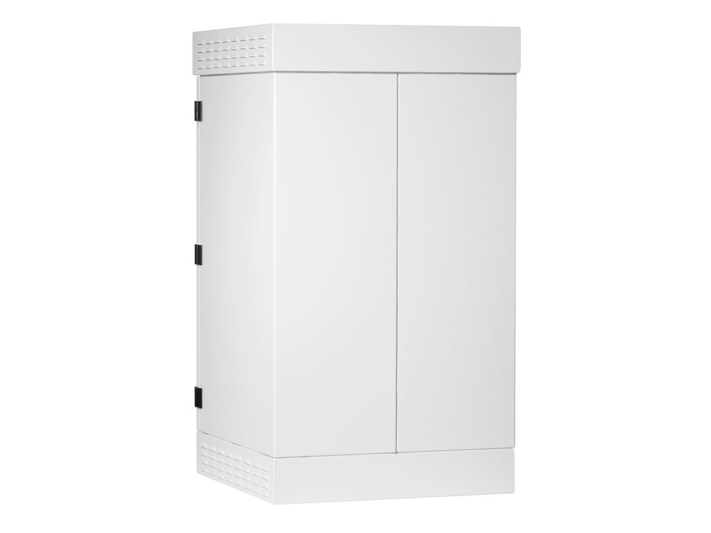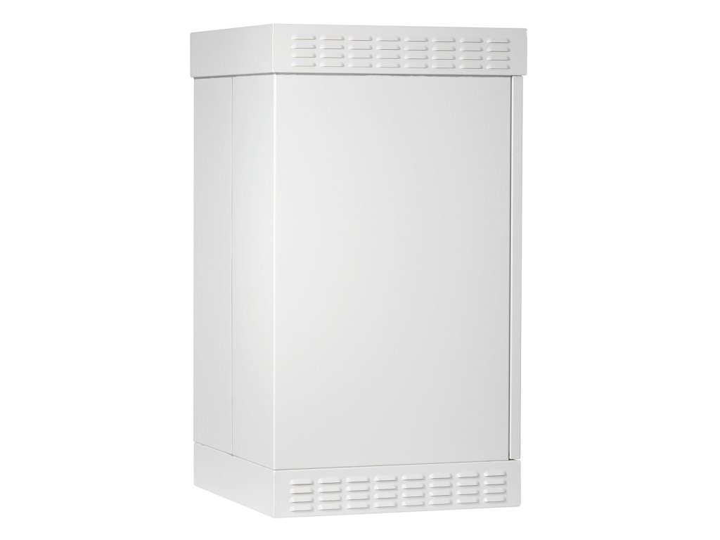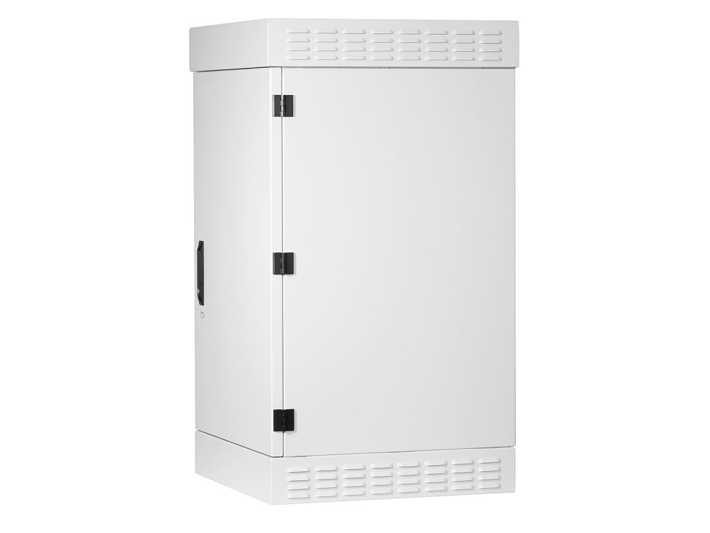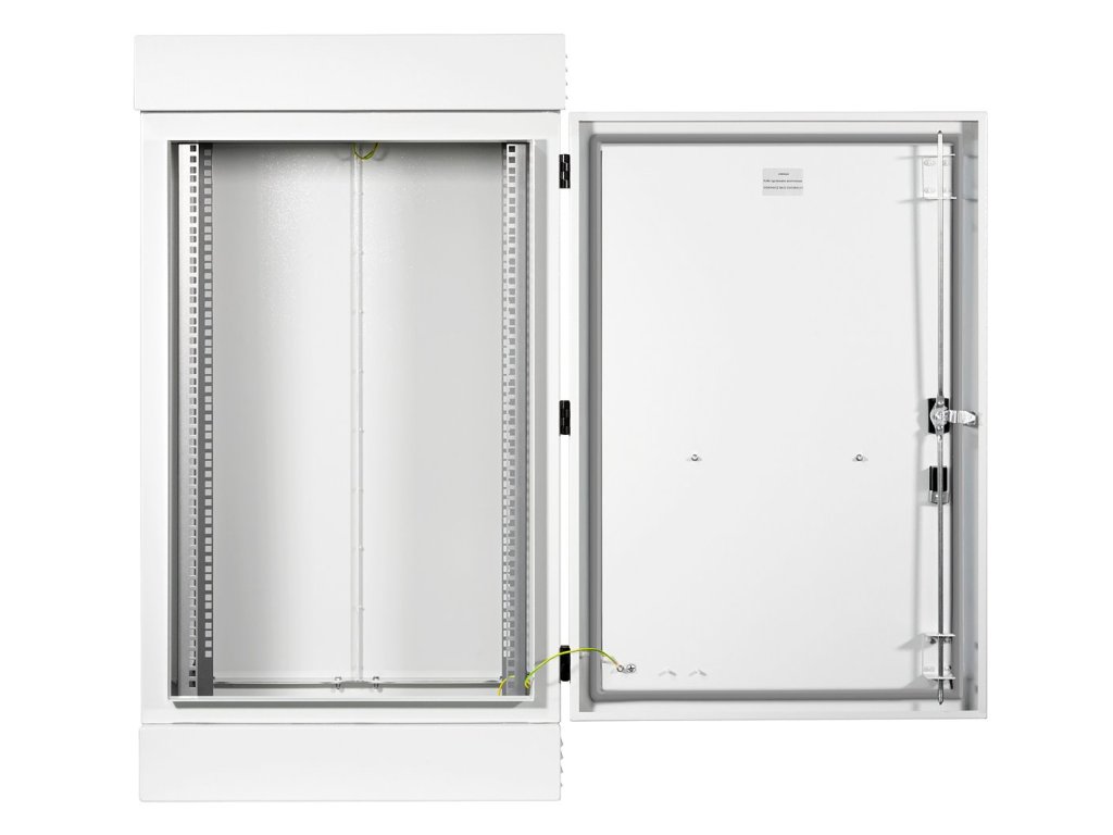 Venkovní hliníková skříň 18U RACK 19'' o rozměrech 600x600 mm, namontovaná na ocelovém nebo hliníkovém základu. Stupeň krytí IP54. Skříň je vyrobena z hliníku, tělo skříně je kompletně svařeno laserem.