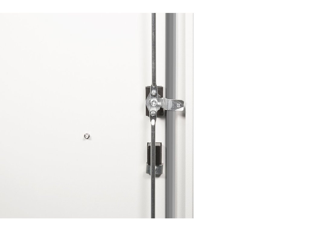 Dveře skříně jsou osazeny na vnitřních ocelových závěsech a uzamčeny čtyřbodovým šroubovým systémem vně komory skříně (patentovaný uzamykací systém). Rukojeť s cylindrickým zámkem, možnost výměny cylindrické vložky na místě. Pro vstup kabelů do skříně byla použita kabelová vývodka s krytím IP66. Vstup kabelů do interiéru usnadňuje odšroubovatelná základní deska. Pro zachování těsnosti je na spoji mezi deskou a podlahou vylito těsnění.