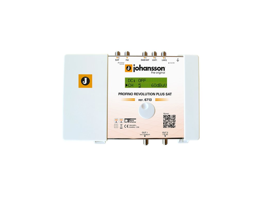 Zesilovač Johansson PROFINO REVOLUTION SAT 6713 je programovatelný terestriální zesilovač s nastavitelnými filtry. Zesilovač disponuje pěti vstupy : 1 SAT + 1 FM + 1 DAB + 2 x UHF. Zesilovač sám detekuje nejvyšší TV kanál připojený do vstupu a podle toho zařazuje vstupní filtr typu horní zádrž pro omezení rušení v pásmu 5G, 4G (LTE) nebo je filtr vypnut při příjmu TV kanálů nad 790 MHz. Zesilovač automaticky načte a zobrazí úroveň signálu zvoleného TV kanálu, to znamená, že při nastavování nepotřebujete měřicí přístroj. V jednotlivých TV kanálech (nebo klastrech) je automaticky v reálném čase (do 20 vteřin) regulována úroveň signálu pomocí AGC, tak aby na výstupu zesilovače byly úrovně konstantní. Zesilovač neumožňuje kmitočtovou konverzi televizních kanálů. Zesilovač umožňuje zpracovat více než 20 TV kanálů (multiplexů). Na výstupu zesilovače je možné zařadit náklon na UHF pásmu 9 dB (oproti referenčnímu kmitočtu 174 MHz) a v pásmu SAT 0 až 12 dB pro kompenzaci útlumu rozsáhlého televizního rozvodu na vysokých kmitočtech. Do tří vstupů zesilovače (DAB + UHF) je možné připojit předzesilovače, pak je nutno v Menu zapnout napájení předzesilovače +12V nebo +24V. V menu je možné zapnout (vypnout) napájení LNB 13V / 18V a 22 kHz. Nastavení celého modulu zesilovače je možné uzamknou heslem proti neoprávněným změnám.