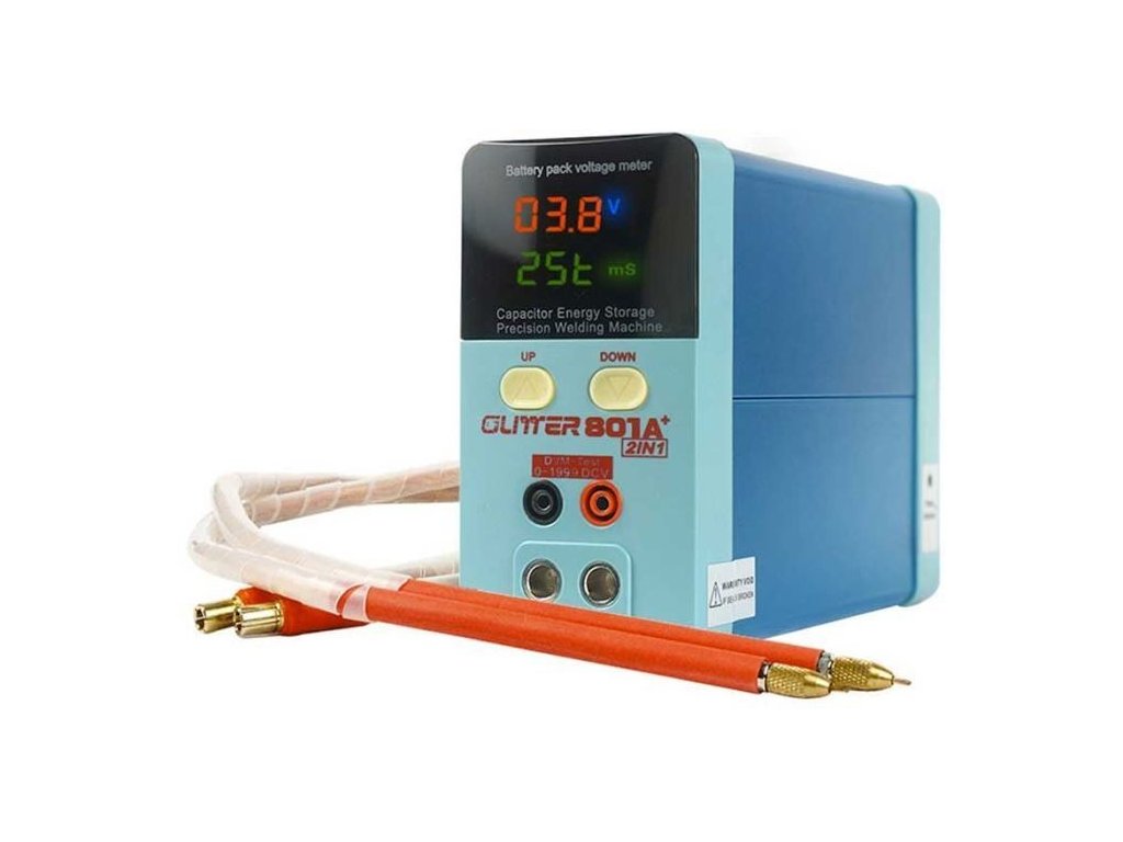 GLITTER 801A+ je kondenzátorová bodová svářečka pro bodové svařování akumulátorů do bateriových akupacků pomocí niklových plíšků. Oproti klasickým svářečkám s transformátorem nabízí nižší hmotnost i rozměry a větší energii pulsu. Svářečka umožňuje i svařování niklových pásků na hliníkový podklad. Svářečka se aktivuje 20ms po přiložení hrotů k plíškům.