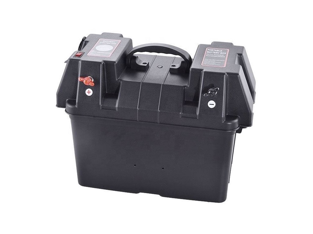 Praktický box pro akumulátor 12V/100Ah s kabeláží, svorkami a zásuvkami 12V+USB. Do víka je možno instalovat menší nabíječku, měnič nebo solární regulátor a tím dále rozšířit možnosti zařízení.