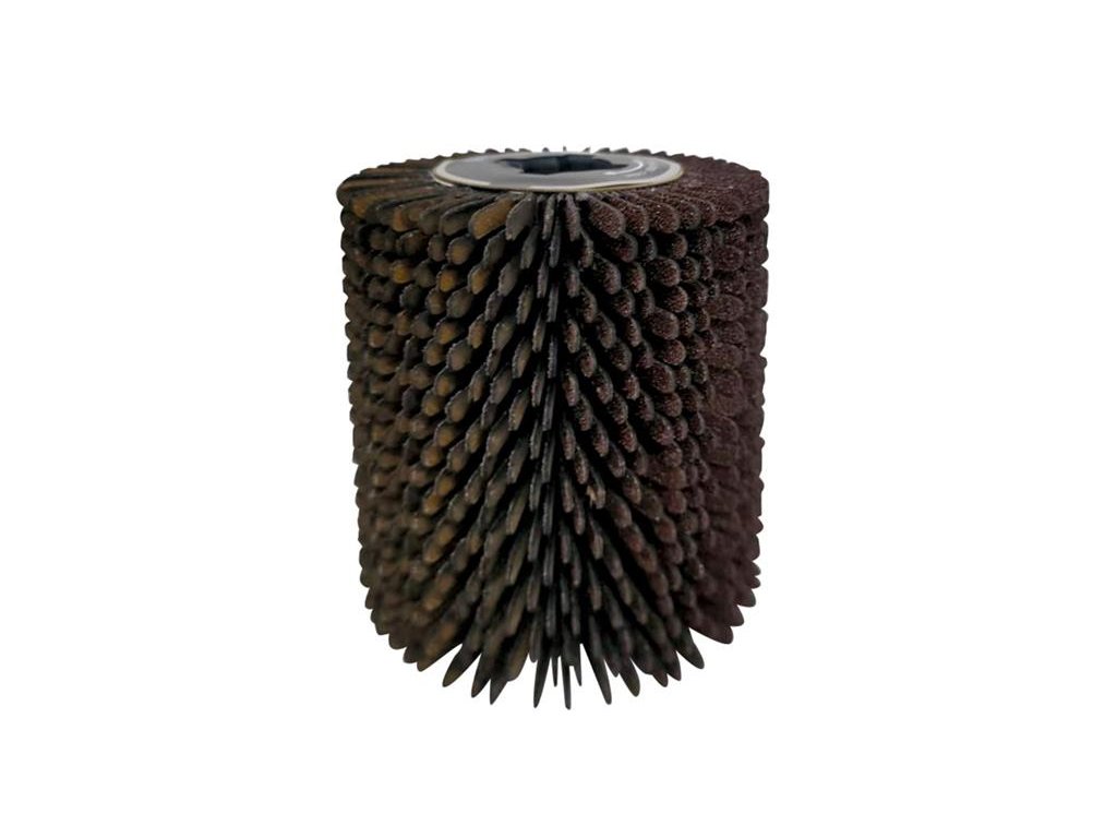 Lamelová konstrukce ze smirkového brusiva: vícevrstvé brusné lamely zajišťují rovnoměrný úběr materiálu a dlouhou životnost nástroje. Konstrukce umožňuje postupné opotřebení bez ztráty účinnosti.