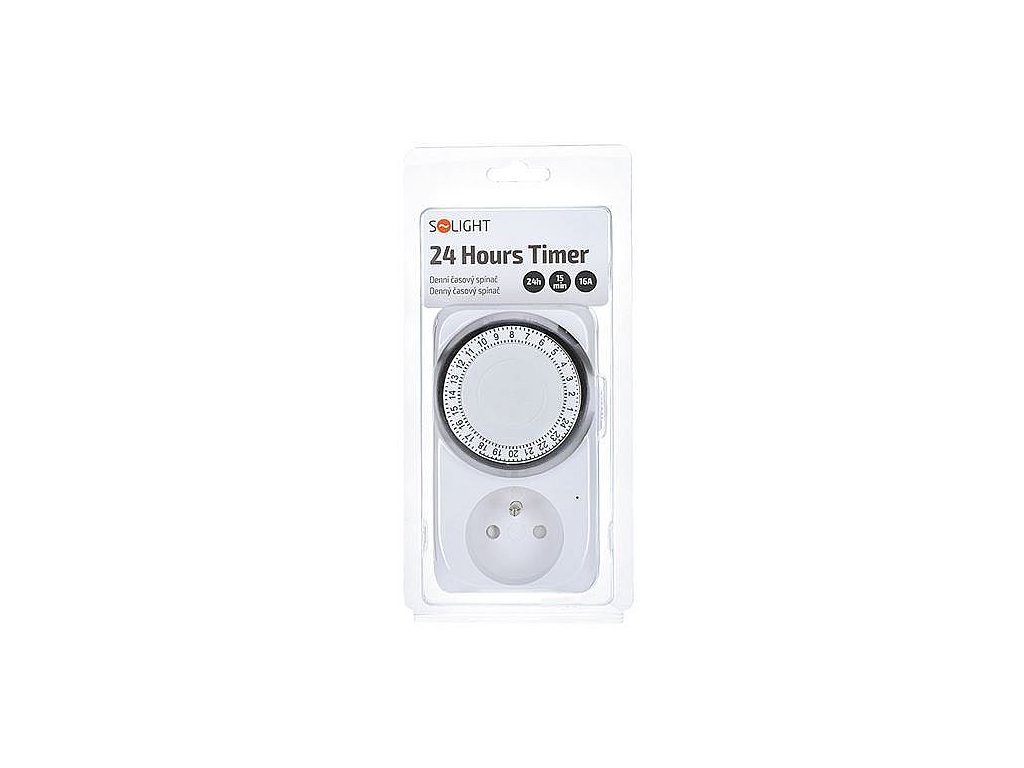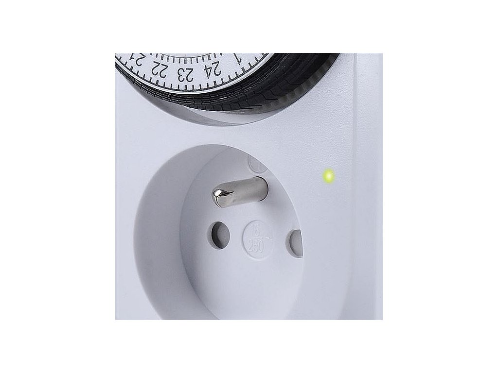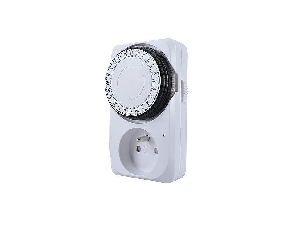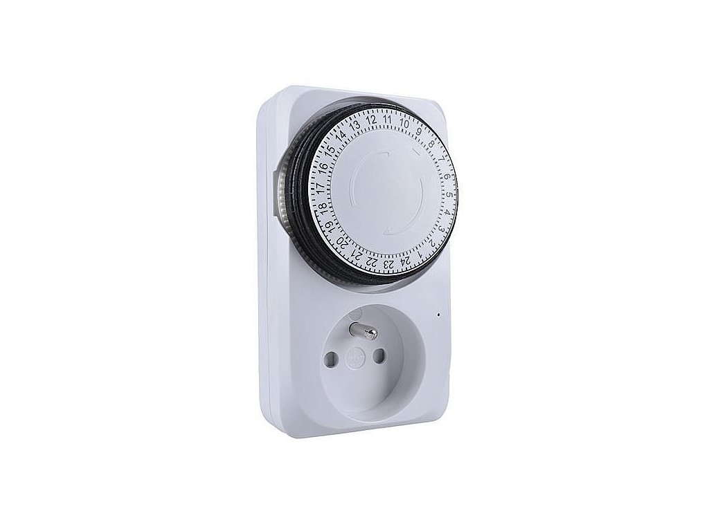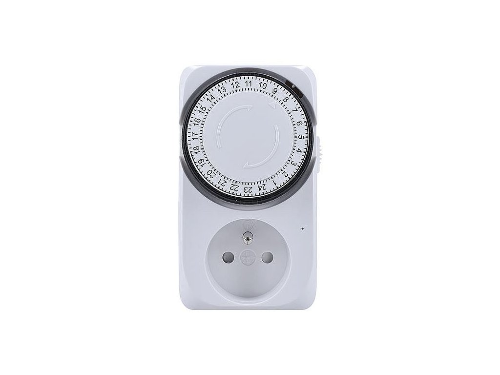 Časový mechacnický spínač s rozpětím 24 hodin, minimálním časovým úsekem 15 minut a dětskou pojistkou