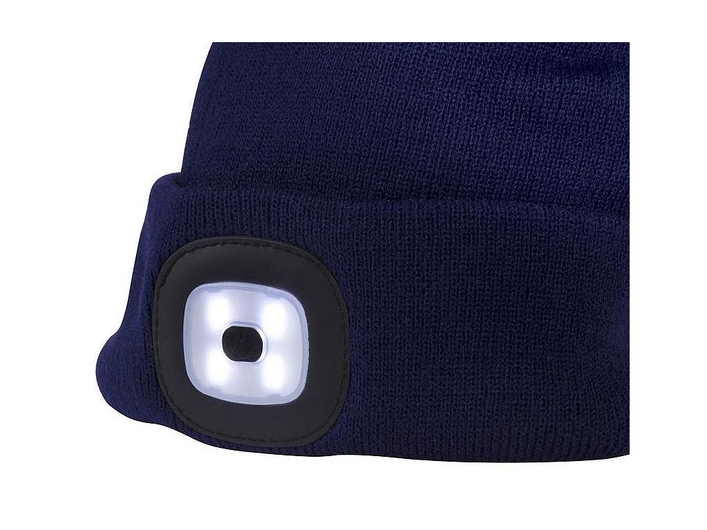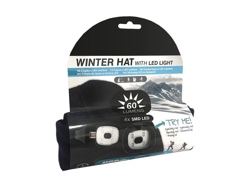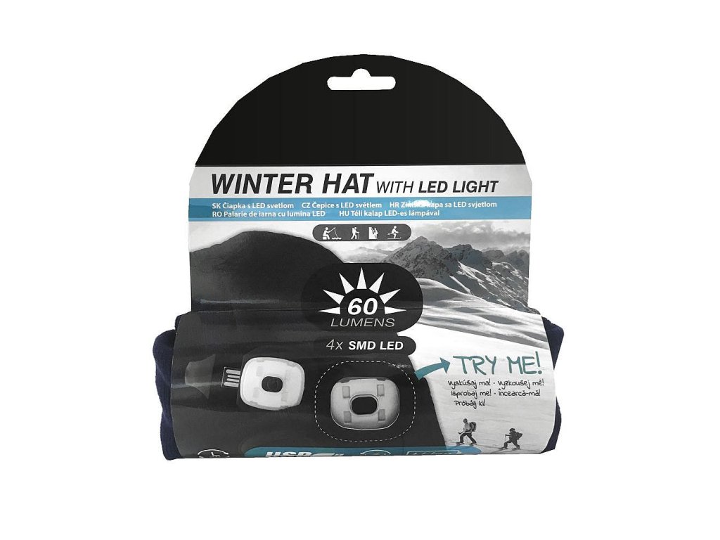 POPIS Pohodlná a teplá čepice do chladného počasí. Univerzální velikost. Nabíjení LED světla pomocí USB portu. 3 stupně intenzity svícení. Možnost praní. SPECIFIKACE Baterie: 3,7 V Li-ion 300 mA Světelný zdroj: 4 x SMD LED Svítivost: 60 lm Doba nabíjení: 3 h Doba svícení: ± 2 h 3 stupně intenzity svícení: 50 / 75 / 100% Materiál: TPR + ABS Rozměry: 63 x 50 mm