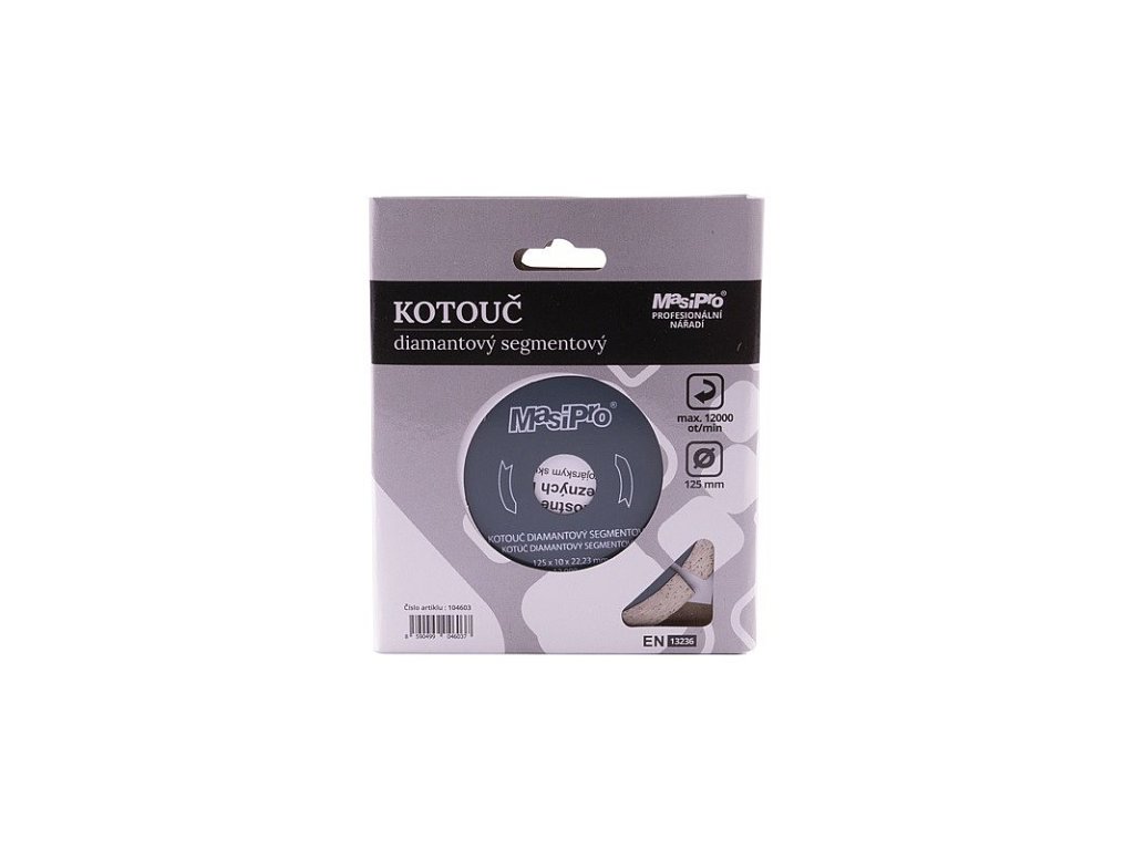 POPIS Segmentový Výška segmentu: 10 mm Tloušťka: 2 mm Kvalitní nosný disk, odolávající vysokým teplotám Vysoký obsah diamantových zrn v segmentu Rychlý a čistý řez Nejvhodnější použití na: beton, železobeton, cihla, zdivo, žula Pro práci za sucha i za mokra Pro úhlové brusky Doporučené vybavení: odsávání prachu Max. otáčky 12 000 ot/min Upínání: 22,2 mm Norma: EN13236