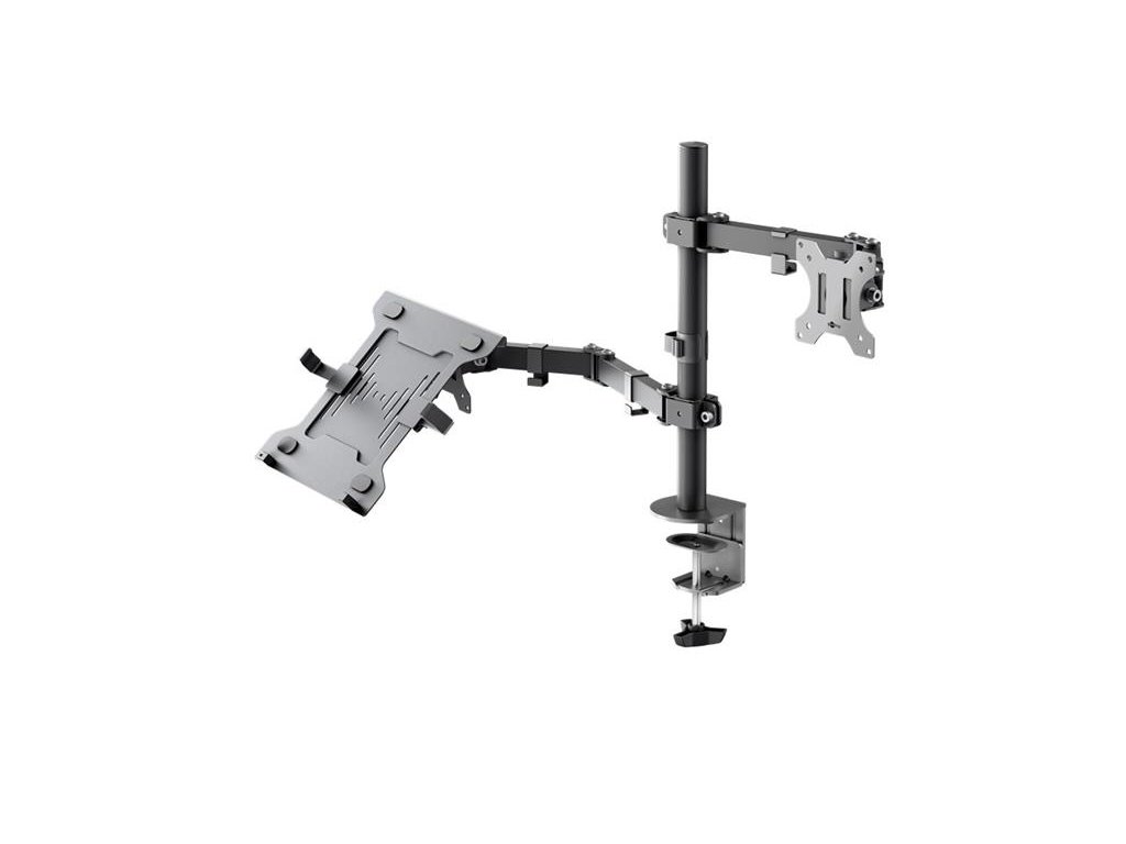Perfektní pro stabilní stolní montáž obrazovky do 8 kg a notebooku do 4,5 kg, výškově nastavitelné, ±90° otočné a ±45° naklápění, 180° rotace, doporučená tloušťka desky: 10-88 mm