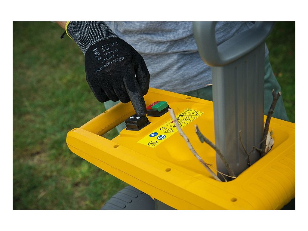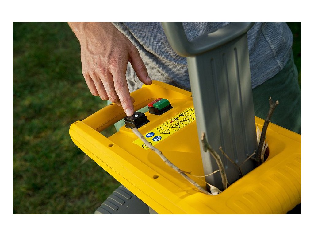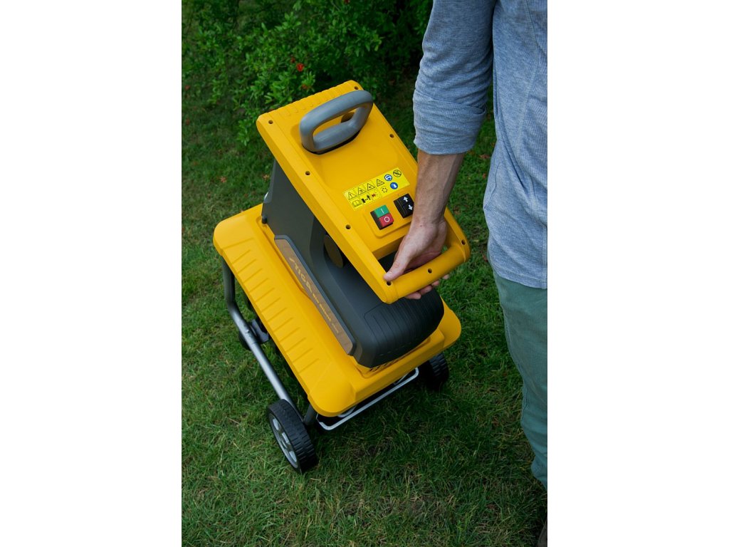 Jeho kompaktní rozměry a dvě zadní kola usnadňují používání a přepravu drtiče.