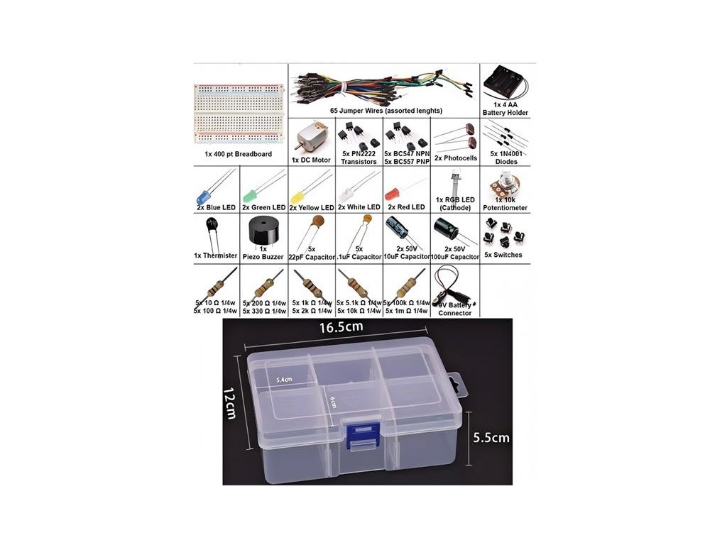 Součástí balení je nepájivá prototypovací deska, množství propojovacích kabelů, různé typy rezistorů, kondenzátorů, tranzistorů, diod, LED diod i senzorů. Sada navíc obsahuje DC motor, potenciometr, fotorezistor, termistor a bzučák, což umožňuje experimentovat se senzory světla, teploty či zvuku.