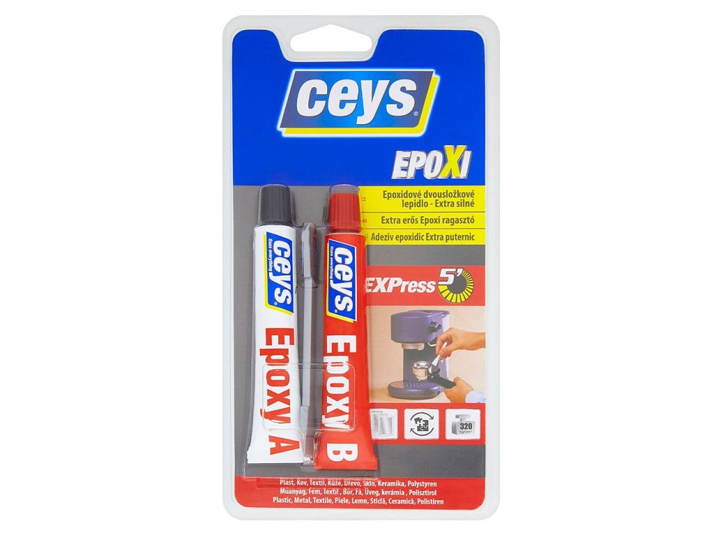 POPISSilné rychle tvrdnoucí epoxidové lepidlo bez rozpouštědel pro všechny typy materiálů.Lze brousit a natírat a je odolný vodě.Má vyplňovací schopností.Ideální pro rychlé spoje s vysokou odolností a opravy.Odolává zátěži až 320 kg/cm2, většině organických a anorganických rozpouštědel, vibracím a teplotě mezi -60 °C až +65 °C.Není vhodné na lepení polyetylenu (PE), polypropylenu (PP), PTFE a silikonu.VLASTNOSTIExtra silnéOdolává zátěži až 84 kg/cm2Rychlé a bezpečné spojeVysoká odolnost vůči teplotám, rozpouštědlům nebo tahovým silámOdolává nárazům, vibracímVyplňující vlastnostiDoba vytvrdnutí: 4 - 6 minutDoba dosažení maximální pevnosti: 24 hodinAPLIKACEŠperkyDomácí spotřebičeMotory a strojeSportovní vybaveníKutilské práceModelářstvíPrůmyslové a řemeslné aplikaceOpravy dílů na lodíchA mnoho dalších..MATERIÁLYLepí všechny materiály*: kov, dřevo, porcelán, sklo, mramor, obklady, kůže, beton…*Není vhodné na lepení polyetylenu (PE), polypropylenu (PP), PTFE a silikonu.ZPŮSOB POUŽITÍPříprava: Lepené plochy musí být očištěné od mastnoty, prachu a jiných nečistot a suché.1. Vytlačte na čistou míchací plochu stejné množství obou složek a zavřete tuby bez prohození víček.2. Dobře smíchejte obě složky špachtlí, až vznikne homogenní směs.3. Naneste tenkou vrstvu směsi na obě plochy a spojte.4. Nechte spojené v pevném kontaktu minimálně 15 minut.SKLADOVÁNÍEpoxiceys Rychle tvrdnoucí lze skladovat při pokojové teplotě až 3 roky, protože jeho složky jsou balené v utěsněných tubách.