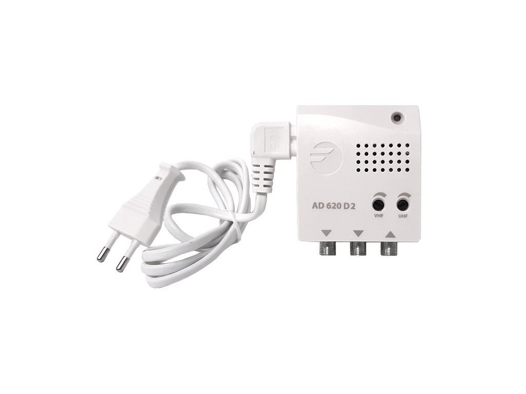 Zesilovač AD 620 D2 je domovní zesilovač určený pro příjem signálů v TV pásmu do 694 MHz a pásmu FM. Má jeden vstup VHF/UHF a dva výstupy. Zesílení je regulovatelné. Je vhodný pro použití v rodinných domech i pro více bytových jednotek. Zesilovač je kompatibilní s LTE700.