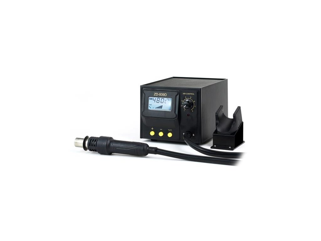 Stolní servisní stanice ZD-939D s displejem má teplotní rozsah 160°C - 480°C. Díky tomu se skvěle hodí na odpájení citlivých obvodů SMD jako QFP, SOP, PLCC, SOJ, BGA a pod. Chrání obvody před poškozením statickou elektřinou a probíjením elektrického proudu. Uplatní se ale i v řadě dalších oblastí použití, u nichž je důležitý koncentrovaný tok horkého vzduchu, např. při čištění 3D tiskáren, při nasazování za tepla, ohřívání materiálů při údržbě nebo montáži. Teplotu lze nastavit na LCD displeji, rychlé zahřátí na provozní teplotu. Množství vzduchu je možné regulovat plynule regulací mebránového čerpadla a pomocí čtyř různých hrotů, které jsou součástí dodávky. Další hroty-nástavce podle tvaru SMD součástky je možné dokoupit. Rukojeť je vybavena protiskluzovou gumou, která nabízí větší pohodlí a usnadňuje manipulaci. Rukojeť horkovzdušné pistole má zabudovaný senzor. Jakmile ji zvednete, okamžitě přejde do pracovního režimu, a jakmile ji vrátíte do držáku, přejde do pohotovostního režimu. Funkce automatického pohotovostního režimu výrazně šetří energii.