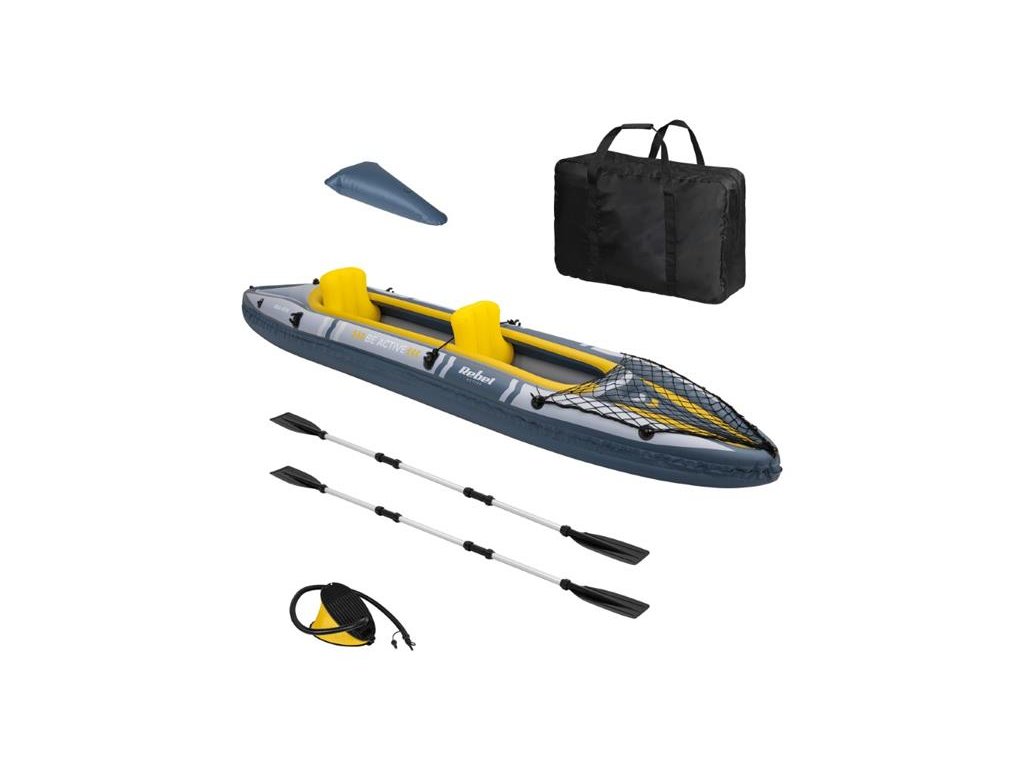 Turistický kajak Rebel Active je dodáván se vším, co potřebujete k okamžité jízdě na vodě. Součástí je nafukovací stupačka, dvě pádla, dvě sedadla, pumpa, přepravní taška, krejčovský metr a opravná sada. Tato lehká a kompaktní sada se snadno sbalí a vezme s sebou kamkoli – od jezer až po pobřežní zátoky.