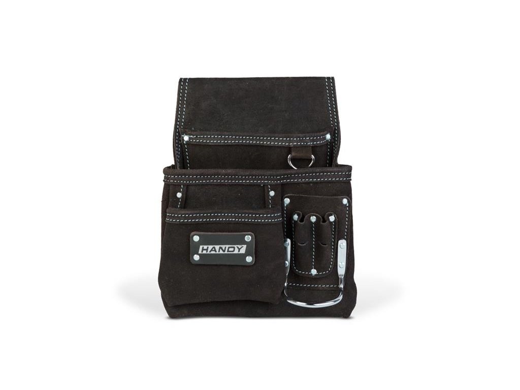 Hašené kožené pouzdro na opasek se 2 velkými kapsami, 2 závěsnými smyčkami, páskem a 4 menšími přihrádkami (např. na tužky). Odolné provedení, zpevněné kovovými nýty.