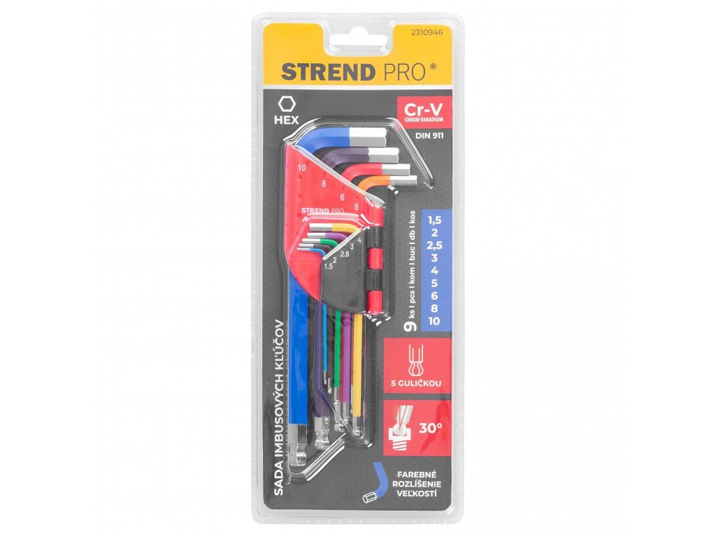 Sada imbusových klíčů obsahuje 9 kusů klíčů ve velikostech 1,5; 2; 2,5; 3; 4; 5; 6; 8; 10 mm.