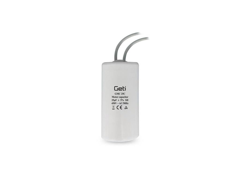 Kondenzátor rozběhový motorový 25uF 450V GETI GMC 25CRozběhový motorový kondenzátor pro čerpadla, sekačky, kompresory, ledničky a jiná zařízení s elektromotorem.