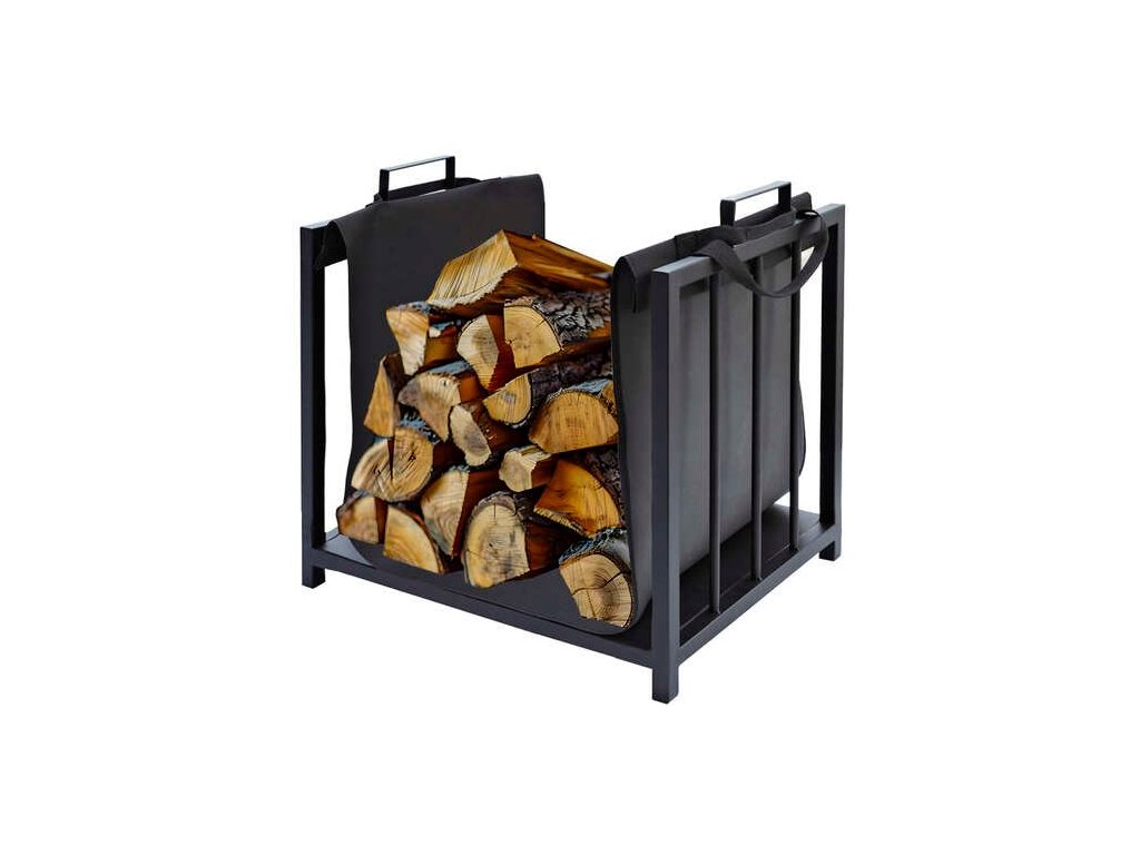 Kovový koš s látkovým přehozem pro přenos a skladování palivového dřeva.