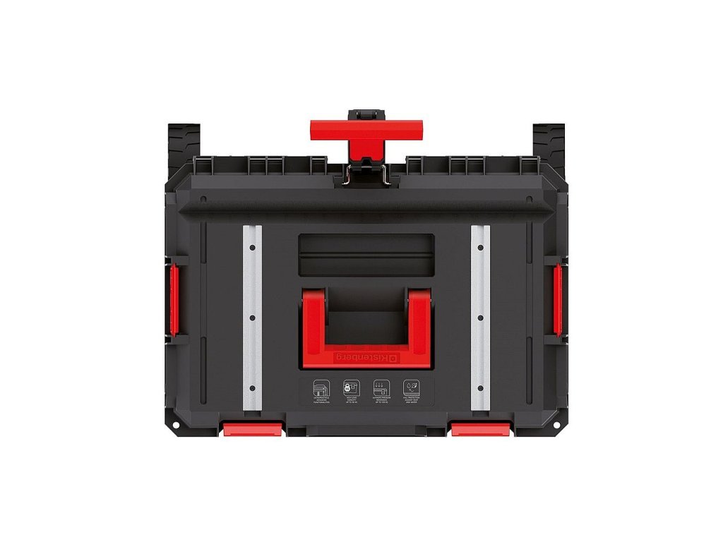 Hliníkové kolejnice, integrované ve víku (umožňují připojit G-svorky), dokážou box proměnit v kompaktní, stabilní dílenský stůl.