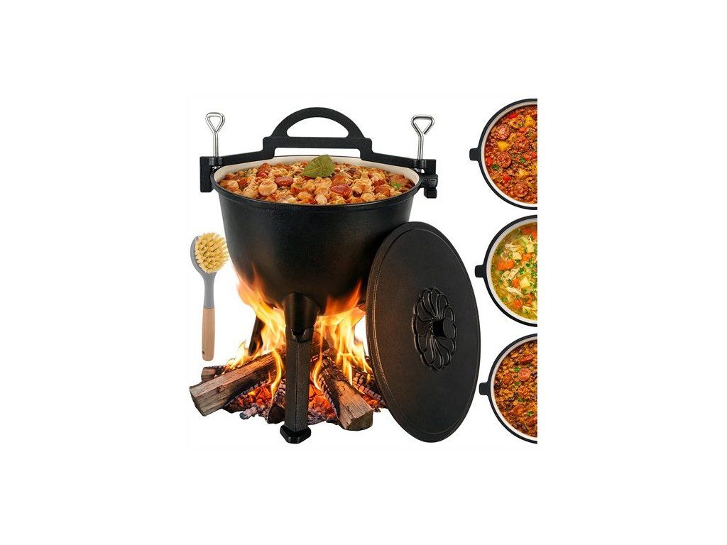 Litinový smaltovaný kotel Kaminer 10L na táborák s poklicí, nohou a kartáčem Už vás nebaví nerovnoměrné vaření v hrncích, které se připalují nad ohněm? Litinový kotel Kaminer o objemu 10 l se smaltovaným vnitřkem vám umožní připravovat vydatná jídla na táboráku, v krbu nebo nad uhlíky – pohodlně a bez neustálého čištění . Je to osvědčená volba pro kempování, zahradu a rodinné výlety.