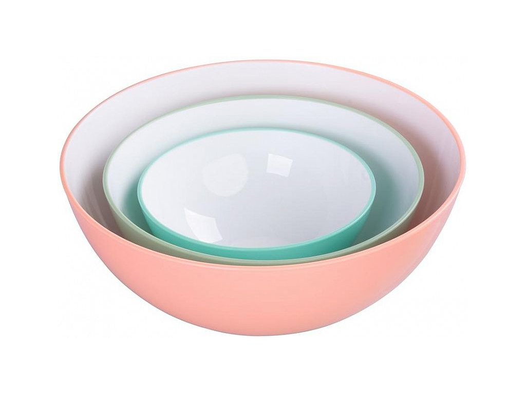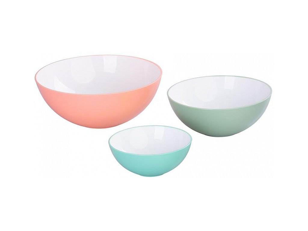 POPIS Sada plastových salátových misek MagicHome v decentních pudrových barvách obsahuje 3 různé misky o objemu 0,6/1,5/3 litrů. Jsou vhodné do mikrovlnky i myčky na nádobí. Materiál: Plast