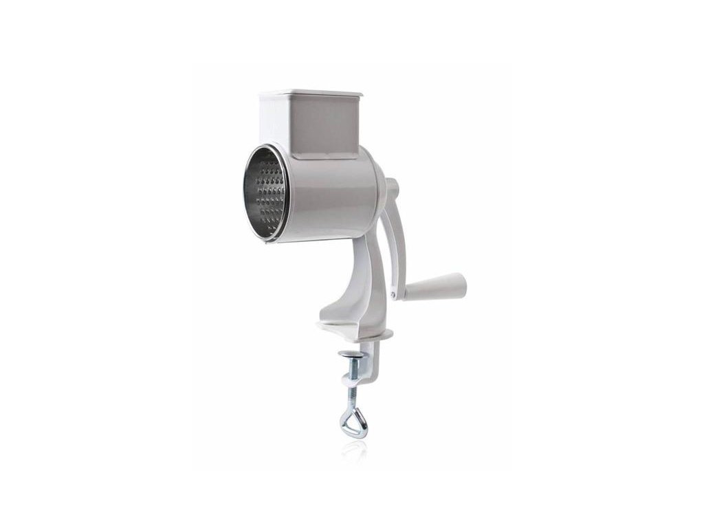Mlýnek na strouhanku o celkové výšce 30,5 cm, buben z pocínovaného plechu s průměrem 7,5 cm, kovové tělo mlýnku je ošetřeno práškovou barvou v bílém odstínu. Vyrobené v České republice.