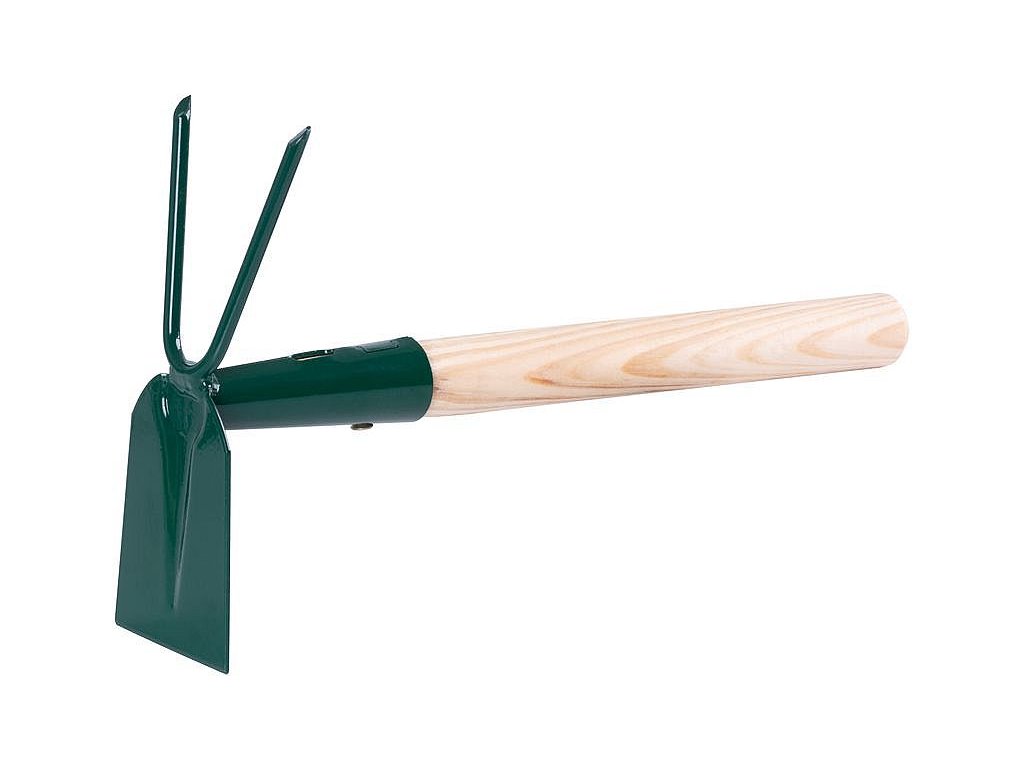 Kvalitní motyčka plochá - dvouzubá s násadou na odplevelování záhonů a provzdušnění půdy.