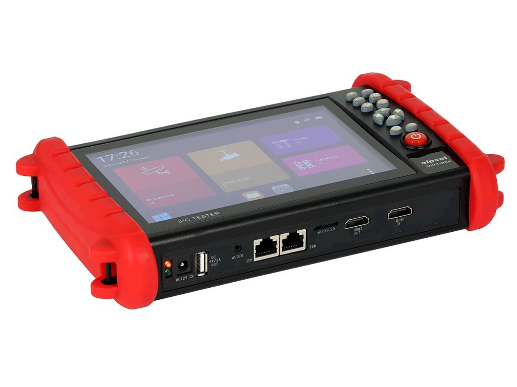Alpsat AS33-IPCX je všestranný nástroj, který usnadňuje realizaci, konfiguraci a údržbu systémů a sítí CCTV. Přístroj je kompatibilní s IP kamerami (až 8 Mpix) a HD-CVI, HD-TVI (až 8 MPix) AHD (až 5 MPix) a CVBS. Díky vysokému rozlišení monitoru, 1920 x 1200, si můžete obraz z kamery prohlížet ve vysoké kvalitě, což vám umožní doladit nejdůležitější nastavení. Velký dotykový displej a další ovládací tlačítka zajišťují mimořádně uživatelsky přívětivé ovládání.Vestavěný vstup HDMI IN umožňuje připojení externího zařízení, například videorekordéru. To umožňuje zobrazit obraz z tohoto zařízení a konfigurovat jej lokálně. Výstup HDMI OUT naopak umožňuje připojit tester k externímu monitoru nebo jinému displeji.