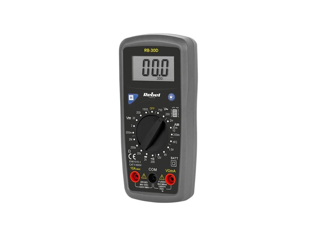 Multimetr REBEL RB-30DUniverzální měřič REBEL RB-30D je kompaktní a multifunkční měřicí přístroj, který je ideální pro profesionální i domácí použití. Díky svým širokým možnostem měření a ergonomickému designu je nepostradatelným nástrojem v dílně každého elektrikáře nebo elektrotechnika.