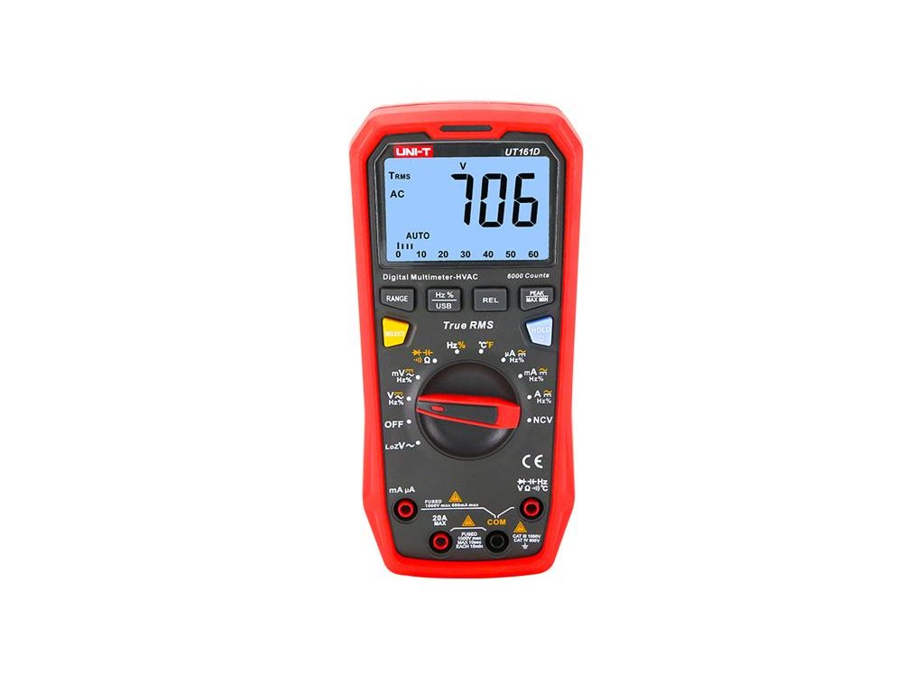 Multimetr UNI-T UT161DNa tento výrobek poskytujeme 3 roky záruku. Řada multimetrů UT161 je řada vysoce spolehlivých, bezpečných, odolných a přesných multimetrů, které mají certifikát CE a jsou vhodné pro evropský trh. Displeje těchto multimetrů jsou podsvícené LCD (tmavé údaje na světlém pozadí) s počtem míst ±6000 (pro UT161B a UT161D) a ±22000 pro UT161E. Displeje mají obnovovací frekvenci 2 - 3x za vteřinu, obsahují také analogový sloupec se 31 segmenty (UT161B a UT161D) nebo 41 segmenty (UT161E). Multimetry měří AC i DC napětí do 1000V a jsou vybaveny zvukovým a optickým varováním při dosažení maximálních hodnot napětí / proudu, příp. teploty. Umožňuje bezkontaktní detekci vodičů s AC napětím. V balení je obsažen USB kabel s optoelektrickým převodníkem pro přenos dat do PC. Napájení je čtyřmi kusy mikrotužkových baterií AAA (R03) a přístroj se automaticky vypíná po 15ti minutách nečinnosti (funkci lze dočasně vypnout). Jištění proudových vstupů je provedeno trubičkovými pojistkami, které je možné testovat tímto přístrojem bez otevření.