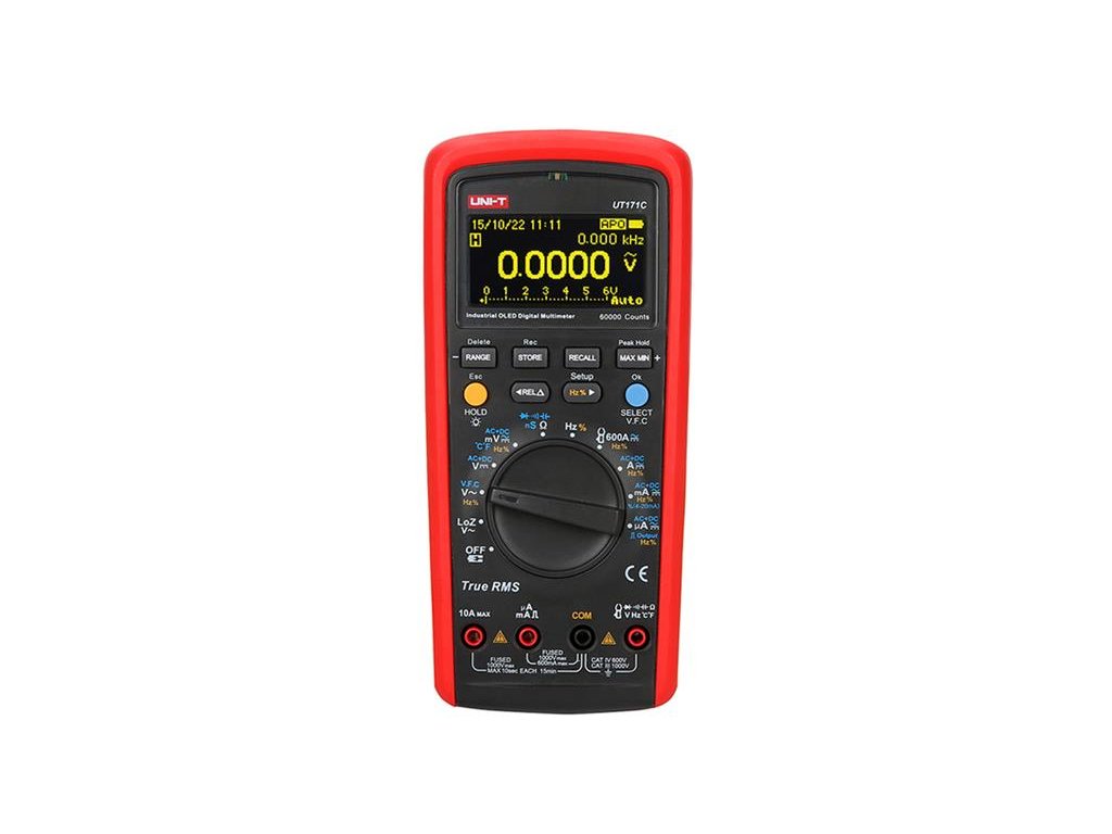 Multimetr UNI-T UT171CŘada multimetrů UT171 jsou ruční multimetry s automatickým i manuálním přepínáním rozsahů a rozlišením 4 3/4 – 4 5/6 digitů. Přístroje se řadí do vyšší střední třídy, vynikají kvalitním provedením a spolehlivostí a jsou vhodné i pro průmyslové použití . Umožňují měření AC/DC napětí a proudů, odporu, test diod, test spojitosti, měření kapacity, frekvence, střídy, teploty, proudové smyčky 4-20mA, vodivosti, VFC, NCV. Přístroje umožňují ukládání dat a připojení pomocí USB s optickým oddělením, nebo pomocí Bluetooth.