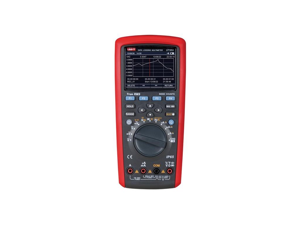 Multimetr UNI-T UT181AMultimetr UNI-T UT181A je inteligentní ruční multimetr s automatickým nebo ručním přepínáním rozsahů, který měří hodnoty efektivní ( RMS ), maximální, minimální nebo průměrné. Přístroj se řadí do vyšší třídy, vyniká kvalitním provedením a spolehlivostí a je vhodný i pro průmyslové použití. Voděodolnost a prachuvzdornost je v kategorii IP65. Displej je typu podsvícený grafický LCD, s maximálním rozlišením 4 5/6 digitů, maximální zobrazená hodnota je ±60000. Multimetr umožňuje měření AC/DC napětí a proudů, odporu, test diod, test spojitosti, měření kapacity, frekvence, střídy, teploty, vodivosti, porovnávací měření, měření relativních hodnot, detekce špiček a záznam dat v počtu až 20000 údajů. Přístroj umožňují ukládání dat do PC pomocí připojení přes adaptér USB s optickým oddělením, nebo pomocí Bluetooth. Součástí displeje je analogový ukazatel - bargraf s 61dílky. Multimetr obsahuje interní hodiny, které zobrazují čas a datum, které je možné automaticky přiřadit uloženým vzorků naměřených hodnot v intervalu 1sec až 1 hod, včetně doby po kterou se má ukládat (až dny). Možnost zařazení dolnopropustného filtru pro měření na střídačích a generátorech. Možnost dvoukanálového měření teplot. Jištění proudových rozsahů je provedeno trubičkovými tavnými pojistkami (rozsah 10A pojistkou FF 10A H/1000V (10 x 38mm); rozsah mA/µA pojistkou FF 800mA H/600V (6 x 32mm)). Přístroj umí testovat své vlastní pojistky (bez otevření přístroje). Napájení multimetru je provedeno lithiovým akumulátorem 7,4V/2000mAh. Součástí balení jsou měřící kabely s hroty v bezpečnostní kategorii CAT III 1000V a CAT IV 600V.