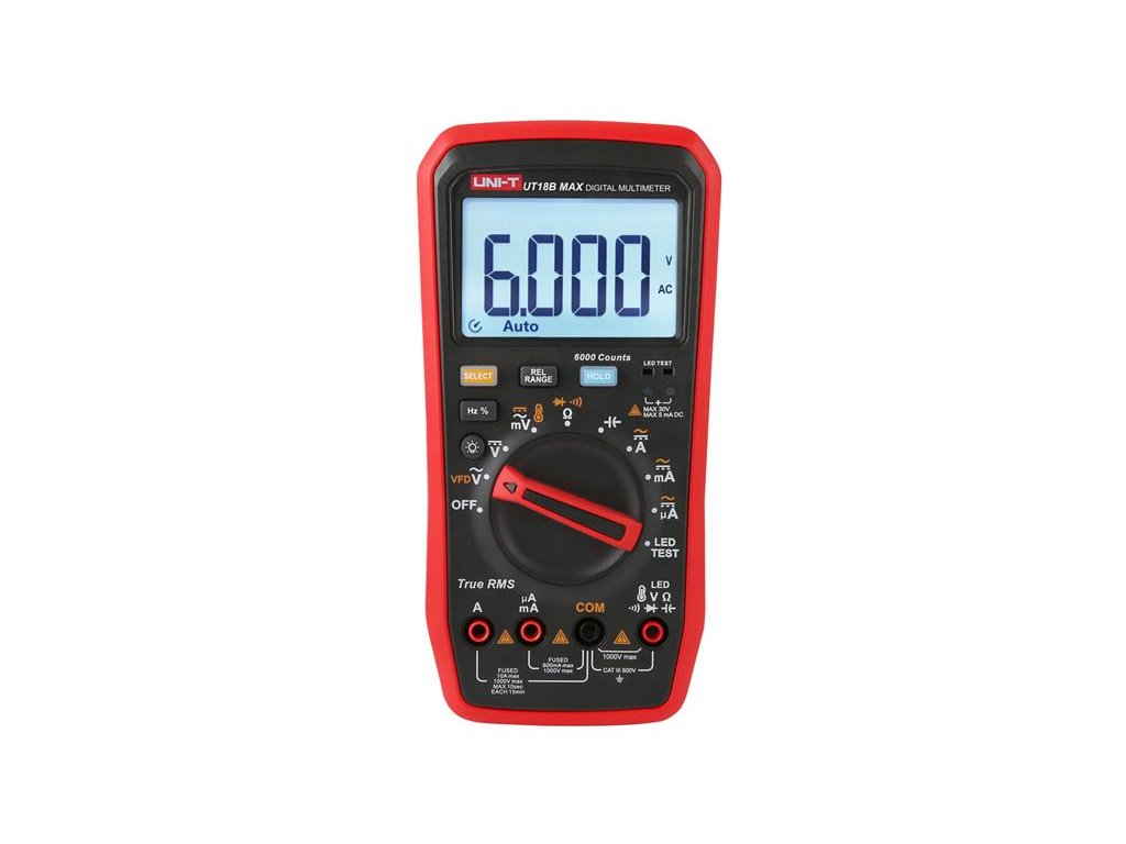 Na tento výrobek poskytujeme 3 roky záruku. Digitální multimetry UT18B MAX je spolehlivý digitální multimetr typu True-RMS. Multimetr je navržen tak, aby odolával rušení, a dokáže odfiltrovat rušení od nosné frekvence překryté sinusovým signálem nebo signálem různého zkreslení napětí a je schopen měřit výstupní napětí pohonu s proměnnou frekvencí. V režimu stejnosměrného/ střídavého napětí může přístroj provádět měření frekvence a pracovního cyklu. UT18B MAX má funkci měření teploty s rozlišením 0,1 C. Funkce testování LED umožnuje UT18B MAX testovat LED s napětím až 12 V, aniž by bylo nutné určovat polaritu.