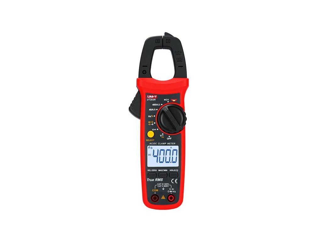 Multimetr UNI-T UT203R klešťovýNa tento výrobek poskytujeme 3 roky záruku. Digitální klešťový měřič UT203R slouží pro měření střídavých a stejnosměrných napětí do 600V, AC a DC proudů do 600A a frekvece 10Hz až 60kHz u napětí nn do 600V a 10Hz až 10MHz u napětí mn. Na všech rozsazích má ochranu před větším napětím než 600V a zvukový a optický alarm. Čtyřmístný více segmentový displej o rozměru 37 x 25 mm se zadním podsvícením a rychlou obnovovací frekvencí (3krát/s) . Rozevření čelistí umožňuje měření na kabelech o průměru až 28mm. Bezkontaktní snímání elektrického pole (NCV) umožňuje detekovat vodiče pod napětím ve dvou citlivostech -EFLo a - EFHi pro rozvody nn 110V/50/60Hz a 230V/50/60Hz. Přiložená sonda - kryt hrotů na testovacích kabelech umožňuje měření na rozvodech nn v kategorii CAT III bez nebezpečí vzniku oblouku. Bez krytů na hrotech lze měřit testovacími kabely jen na rozvodech nn kategorie CAT II. Napájecí baterie 2ks 1,5V R03. Příkon měřiče je cca 1,8 mA. Obvod má funkci automatické úspory energie. Spotřeba v režimu spánku je <11μA, což účinně prodlužuje životnost baterie na cca 400 hodin.