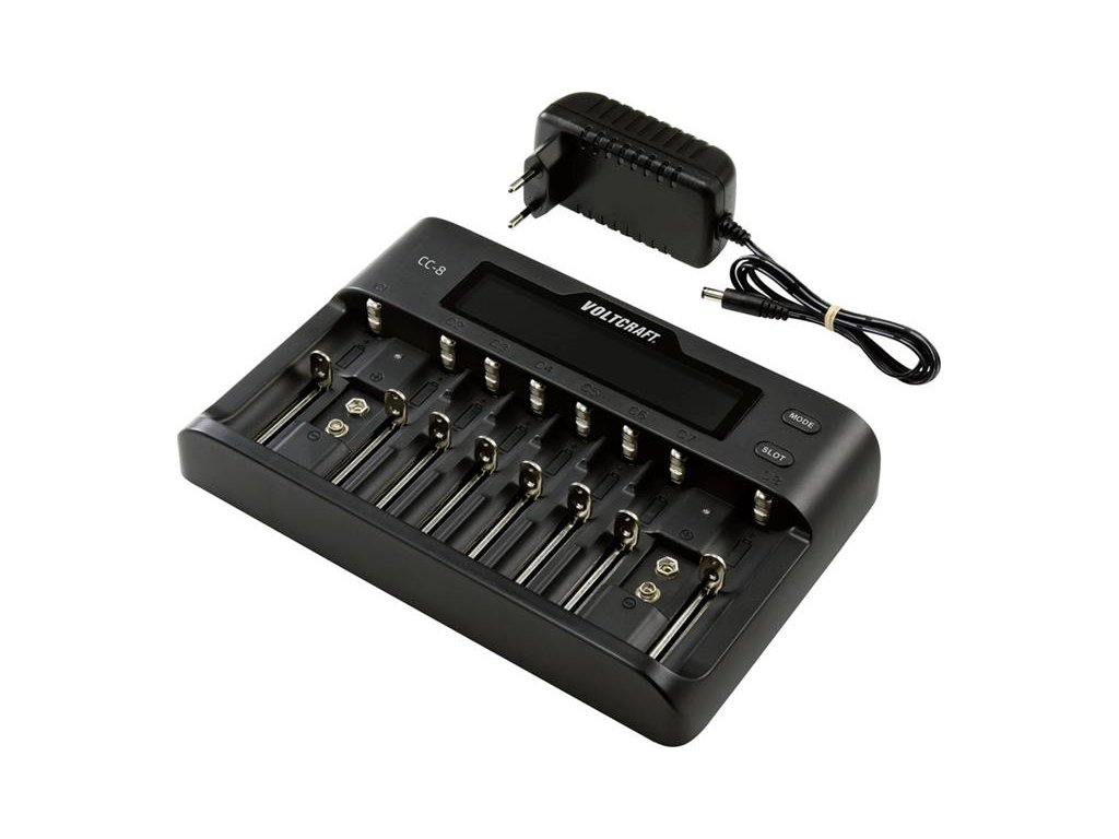 Voltcraft CC-8-nabíjí NiMH/ NiCD, Li-Ion a LiFePo4. Nabíječka je kompatibilní s maximální délkou akumulátor 74 mm. Nabíječka má deset nezávislých nabíjecích slotů, včetně dvou 9V bloků . LCD zobrazuje všechny potřebné informace, jako např. Akumulátor napětí (V), nabíjecí proud (mA), kapacita (mAh) a stavu v % pro vybrané slot.