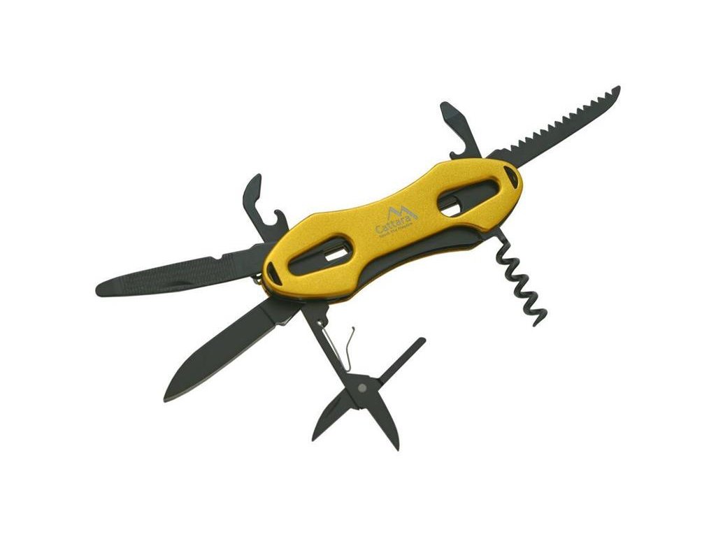 Multifunkční nůž CAMP 7v1 z aluminia žluté metalické barvy, s nástroji z nožířské oceli. Užitečný pomocník pro camping, rybaření a další outdoor využití.