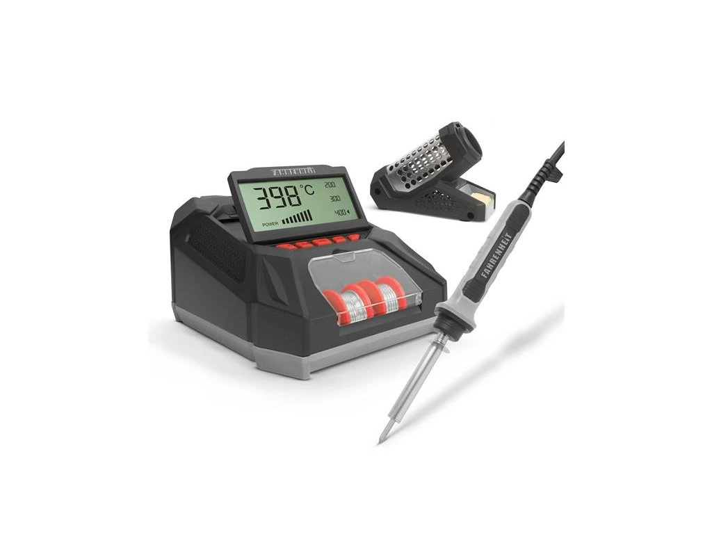S nejnovější pájecí stanicí Fahrenheit můžete pájet elektronické komponenty snadno a efektivně. Díky kompaktnímu rozměru nezabírá mnoho místa na stole, ale disponuje všemi funkcemi, které můžete potřebovat. Velký výklopný LCD displej v horní části zařízení umožňuje sledovat aktuální a cílovou teplotu pájecího hrotu, jakož i aktuální výkon. kterou právě potřebujete.. Nejpopulárnější teploty pájení dostala speciální tlačítka pro rychlou manipulaci (200-300-400°C). Stupně teploty můžete nastavit na stupnici po 10 ° C. Držák páječky a dlouhý kabel vám zaručí pohodlné provádění práce. Díky držáku na cín, držáku na houbu a náhradnímu pájecímu hrotu zabudovanému v pájecí stanici je potřebný pomocný materiál a příslušenství vždy po ruce.