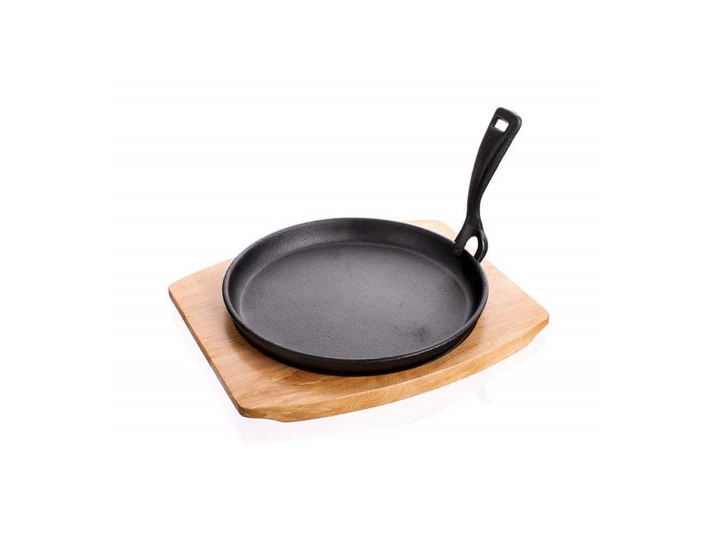 Kulatá litinová pánev 22 cm na dřevěném prkénku, odnímatelné litinové držadlo na vyndávání pánve z trouby. Pánev je vhodná pro zapékání pokrmů, lze jí použít pro přímé servírování, dřevěné prkénko slouží jako podložka pod horkou pánev. Pánev lze použít pro přímé servírování, dřevěné prkénko slouží jako podložka pod horkou pánev.