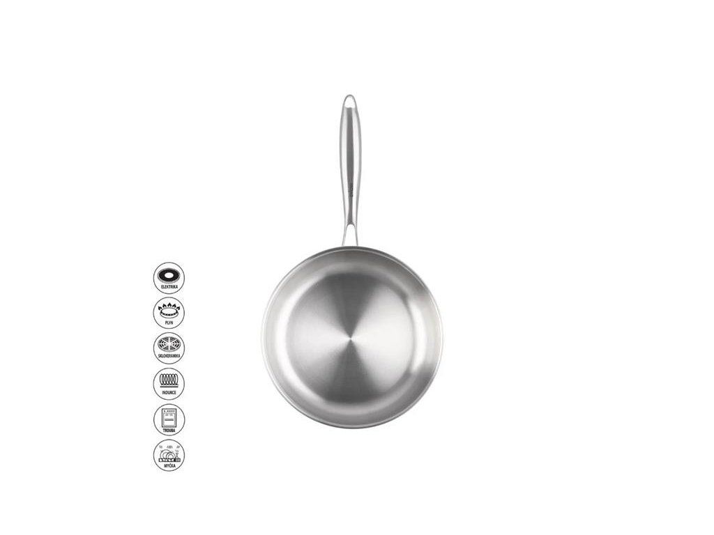 Nerezová pánev představuje díky moderním technologiím a použití kvalitních materiálů výrobek vhodný pro každou moderní domácnost a je ideální volbou pro zdravé, dietní a ekonomické vaření. Zaručuje dlouhou životnost, odolnost a maximální hygienu při přípravě i uchovávání pokrmů. 3vrstvá kvalitní nerezová pánev umožňuje rychlé zahřátí, vaření, dušení i smažení s minimálním množstvím tuku, bez ztráty vitamínů a minerálů obsažených v potravinách. Nahromaděná energie efektivně předává teplo po celé ploše pánve až do okrajů, takže lze tepelný zdroj vypnout s předstihem, což přináší rychlé a úsporné vaření s výraznou úsporou energie. Leštěný vnitřní i vnější povrch brání usazování nečistot a zajišťuje snadnou údržbu, přičemž zachovává přirozenou chuť a hmotnost připravovaných potravin. Pánev je PTFE free, PFOA free, PFOS free a PFAS free, čímž garantuje zdravé vaření bez uvolňování škodlivých látek a šetrnost k životnímu prostředí. Je vhodná pro všechny typy sporáků včetně indukce, použitelná i v troubě, je nutné ji zahřívat postupně. Teplotní šok může způsobit konkávnost dna. Maximální teplota pro zahřátí 220 °C. S ergonomickou rukojetí pro pohodlné uchopení a manipulaci, s možností zavěšení. Při vaření můžete používat všechny typy kuchyňského náčiní, včetně kovových, ale doporučujeme převážně dřevěné a silikonové.
