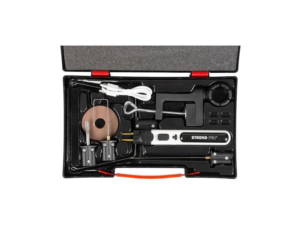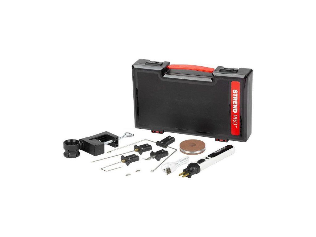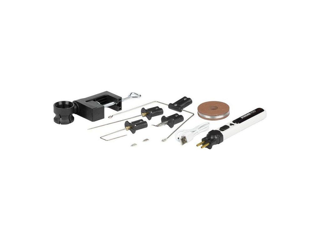 Balení obsahuje akumuátorové pero, vidlici s řezacím drátem (10 m x 38 mm), řezací nůž ve tvaru U, řezací jehlu, svorku pro upevnění k pracovnímu stolu, nástavec s pájecím hrotem a USB-C nabíjecím kabelem.