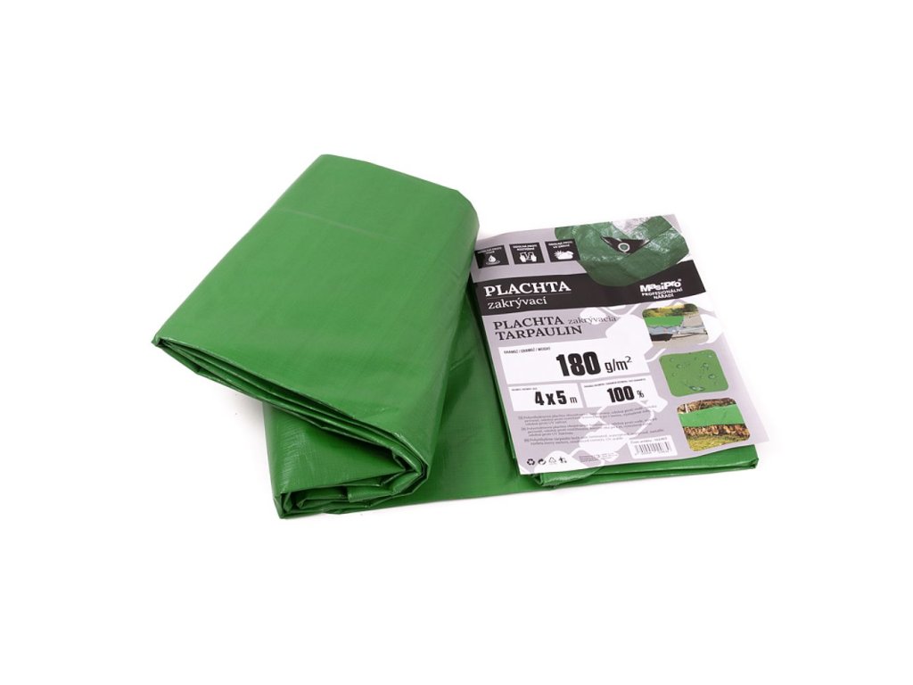 Polyetylenová plachta, oboustranně laminovaná.Po obvodě opatřena hliníkovými oky každých 100 cm.Odolná vůči povětrnostním vlivům a UV záření.Tolerance váhy + - 5 %100 % garance rozměru.Vyztužené rohy.Profi kvalita.Hustota: 180 gRozměr: 4x5 m