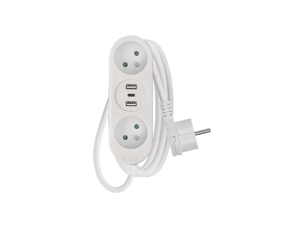 Bílý prodlužovací přívod, 2 zásuvky s dětskými clonkami a délkou 1,4 m. Průřezem vodiče 1,5 mm2. Vhodný pro maximální zátěž 16 A max.