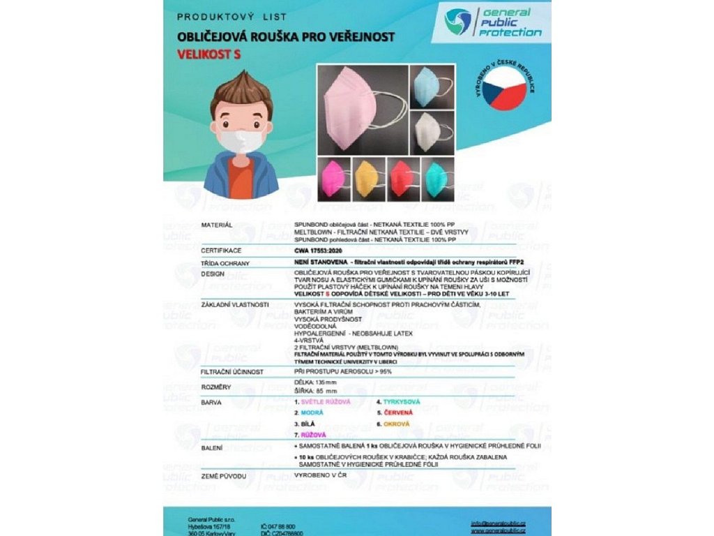 Obličejová rouška pro veřejnost s tvarovatelnou těsnící páskou kopírující tvar nosu velikosti S.