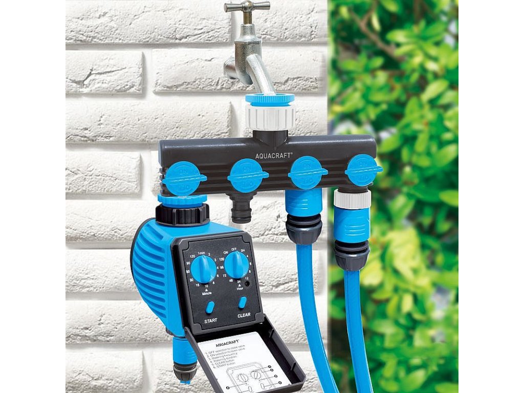 POPIS Rozbočovač hadicový se 4 pozicemi k připojení rychlospojkami. Čtyři samostatné nastavitelné spojky na hadici nebo časovač. Všechny spojky mohou být použity současně. Potažený...