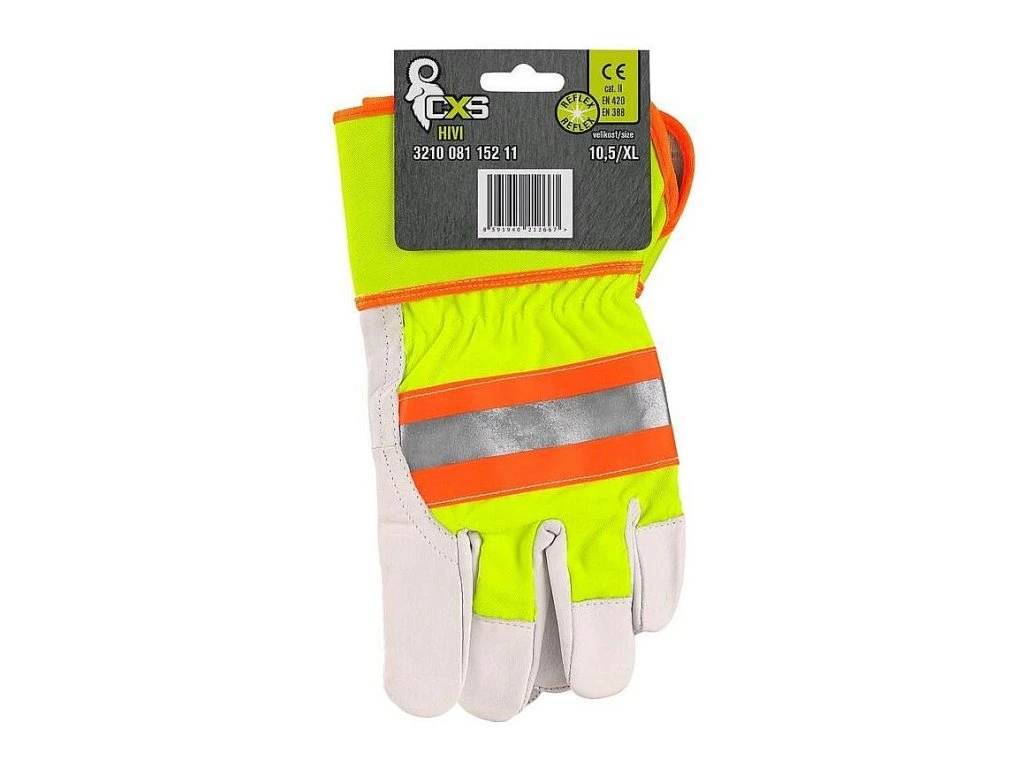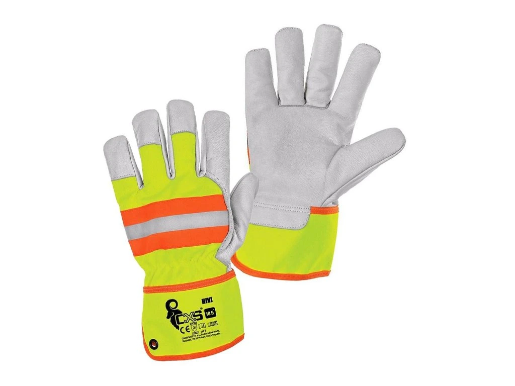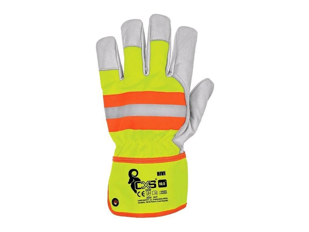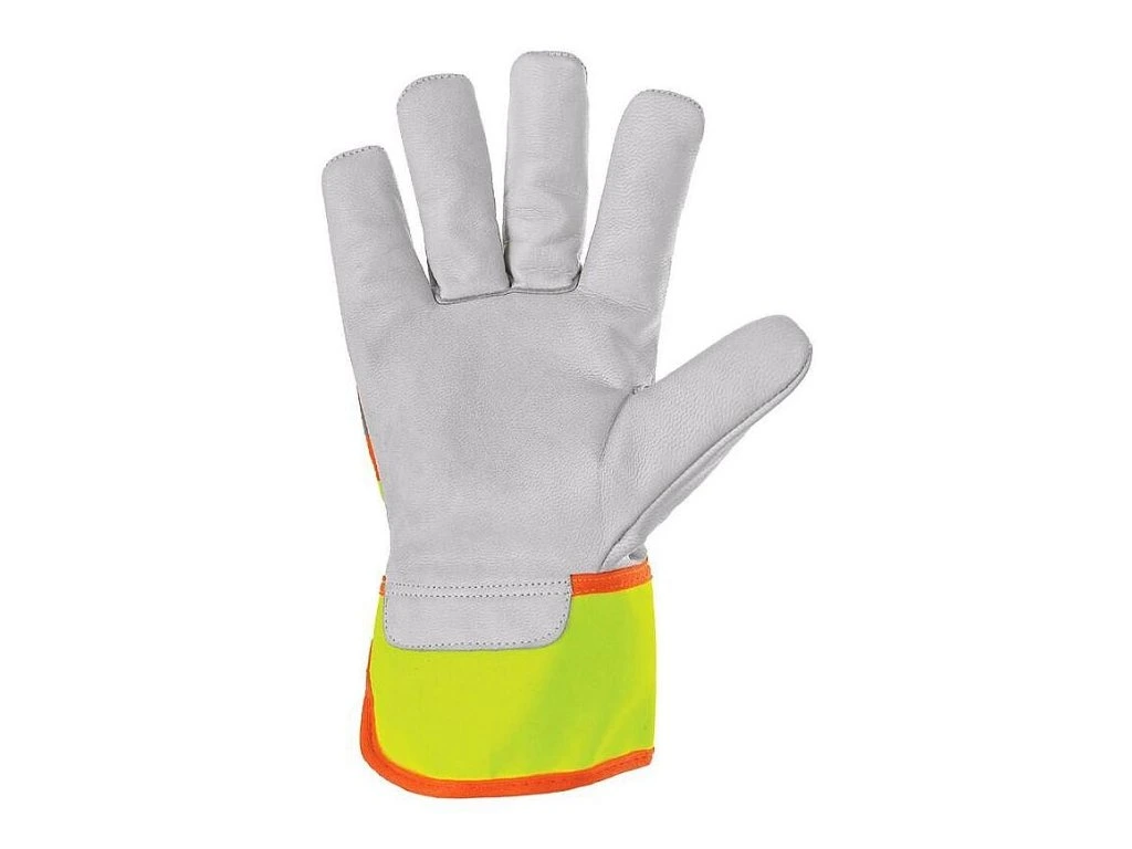 POPIS Kombinované rukavice, žluto-oranžové s reflexním doplňkem. Kovové očko v manžetě pro zachycení na karabinu. Baleny s blistrem. Doporučené aplikace: logistika, lehký průmysl, hobby, autoservisy, stavebnictví. SPECIFIKACE Materiál: dlaň - kozinková lícovka; hřbet - bavlna a polyester Norma: EN 388, EN 420 Délka: 28 cm Velikost: 10,5