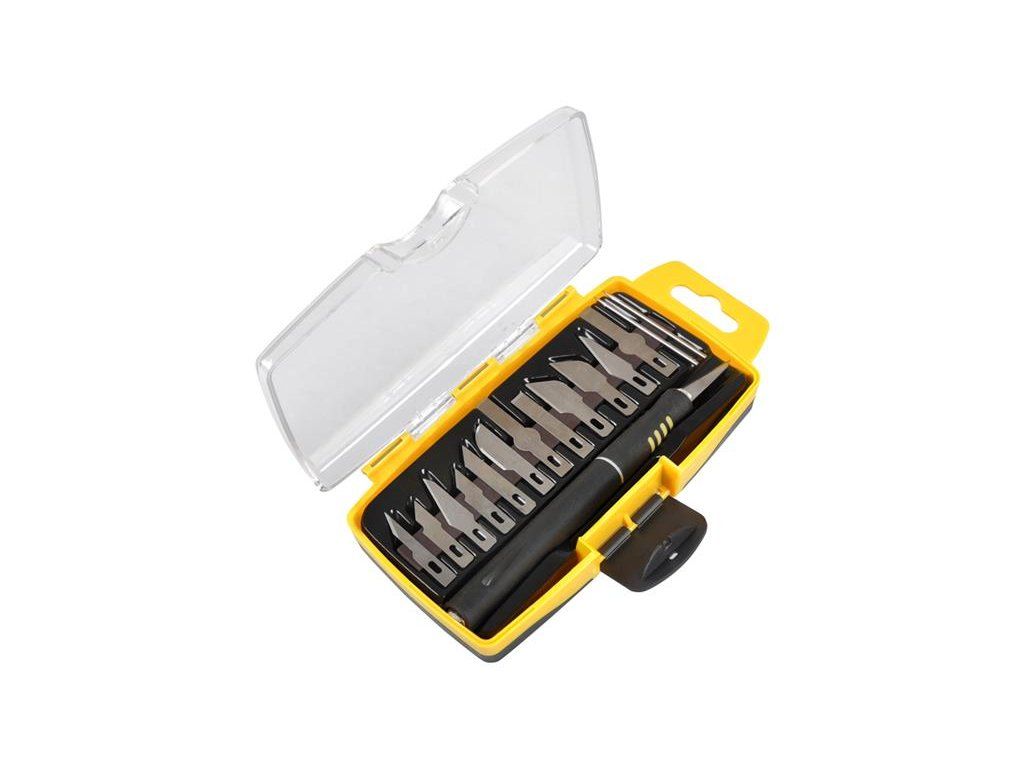 Sada hobby nožů FIELDMANN FDN 1002-16RHobby nože by neměly chybět v žádné kutilské dílně ba i v domácnosti. Třináct čepelí různých tvarů zaručí uživateli možnost zářezu i ve velmi komplikovaných úhlech nebo zákoutí.