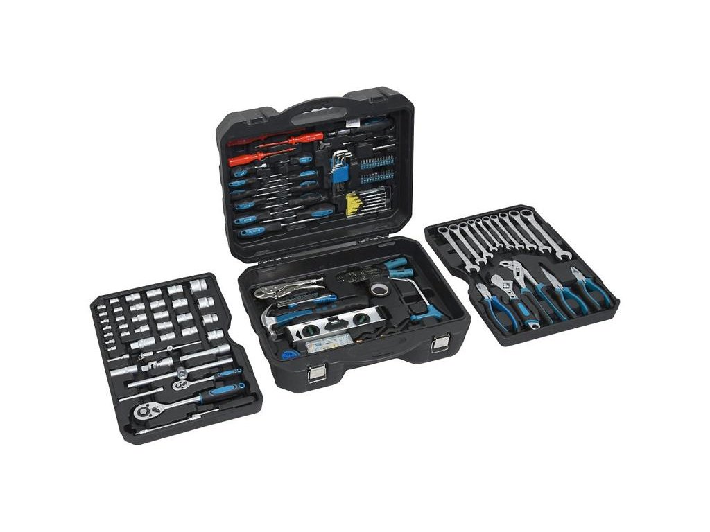 Víko obsahuje izolované, klasické a hodinářské šroubováky, spolu s imbusovými klíči, bity atd. Dále pak vysoce kvalitní ráčny, nástavce, ohebný nástavec, t-vratidla a rúzné prodlužovací nástavce z Chrom-Vanadiové oceli, umístěné ve vloženém platu. Kufr je zhotoven z kvalitního odolného plastu s kovovými sponami, pro bezpečné uzavření. Na zadní straně je opatřen teleskopickou rukojetí a kolečky pro snadnou manipulaci.