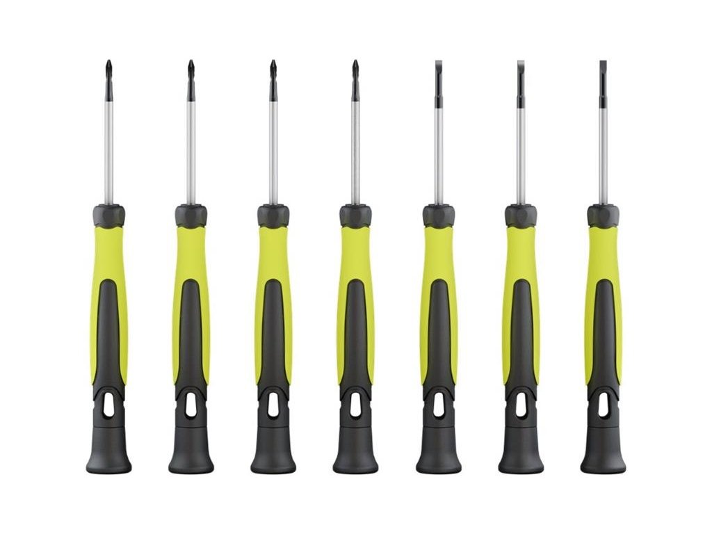7 šroubováků (2× plochý (2 mm, 3 mm), 3× křížový (PH0, PH1), 3× torx (T6, T8, T10)), úložný box