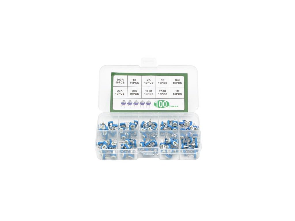 Sada trimrů 100ks 500R-1M ležatý. Trimry jsou v sadě zastoupeny stejným množstvím a to 10ks/typ