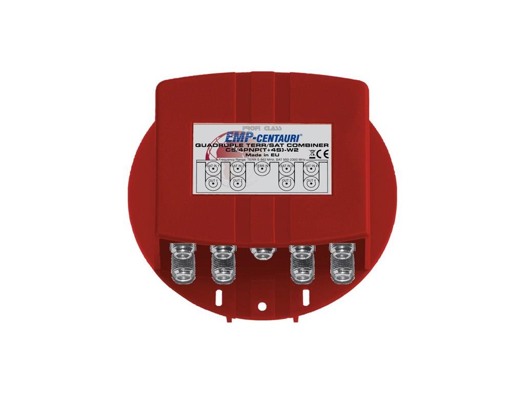Satelitní slučovač (C5/4PNP(T+4S)-W2), 4xSAT IF+TV terr., záruka 72měsícůSatelitní slučovač s obchodním názvem C5/4PNP(T+4S)-W2 (starší název P.107-W) umožňuje připojení až 4 výstupů satelitních konvertorů LNB ( až Quad ) a sloučení s pozemní televizí DVB-T2, případně s pozemním rozhlasem VKV II FM a DAB+ (nahradí rozbočovač do 4 směrů pro pozemní vysílání). Výstup je čtyřmi koaxiálními kabely do 4 pokojů (bytů) k účastnickým zásuvkám SAT+TV+R pro připojení televizorů, satelitních přijímačů a rádií. Provedení s venkovním krytím. Záruka 72 měsíců.