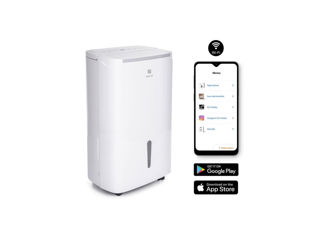 Odvlhčovač s kapacitou odvlhčování až 40 l/24 h. Ovládání přes WiFi s chytrou aplikací. Pro místnost 45 až 55 m2. Příkon 750 W, objem nádržky 7 l, tichý provoz. Dotykové ovládání, chytré funkce, automatické vypnutí při naplnění nádržky. Odvlhčovač G21 Impact 40 s WiFi má kapacitu až 40 litrů za 24 hodin zajistí zdravé a příjemné klima s optimální vlhkostí vzduchu i ve vlhkých prostorách. Oceníte jej při vysoušení po malování, zabraňuje vzniku plísní v koupelnách a vlhkých místnostech, pomáhá po zatopení prostor deštěm nebo velkou vodou. Příliš suchý vzduch člověku neprospívá, příliš vlhký vzduch člověku neprospívá. Jaká je ideální vlhkost vzduchu v obytných místnostech nebo využívaných uzavřených prostorách? Pokud máte v bytě nebo na pracovišti dlouhodobě hodně vlhký vzduch nebo jestli potřebujete jednorázově odvlhčit vnitřní prostor (například sklep po zatopení spodní vodou), bez kvalitního odvlhčovače se neobejdete. Odvlhčovač využijete, když vlhkost v bytě nebo na pracovišti dlouhodobě přesahuje 65 %, takže už neprospívá zdraví. V létě je rozpětí 40 - 55 %, v zimě pak 45 až 60 %. Odvlhčovač vzduchu G21 Impact 40 od české značky G21 má kapacitu 40 l za 24 hodin. Je vybaven 7l, dostatečně velkou nádržkou na kondenzát s průhledným indikátorem stavu. Pozorovat jej však ani nemusíte – odvlhčovač se při naplnění nádržky sám vypne. Odvlhčovač používá ekologické chladivo R290, které nepoškozuje ozónovou vrstvu. Odvlhčovač pro domácnosti využijete při odvlhčování ploch o velikosti 45 až 55 m2. Díky promyšlenému řešení jej můžete snadno přesouvat mezi místnostmi a používat tam, kde je právě třeba – večer ve vlhké koupelně, ráno v pokoji, kde se suší prádlo, odpoledne ve vlhkém sklepě. Odvlhčovač vzduchu jsme vybavili nejen intuitivním dotykovým ovládáním, ale i WiFi. Ovládat jej tak můžete i na dálku – prostřednictvím chytré aplikace G21 Smart Home jej spustíte odkudkoliv a kdykoliv. Nechybí ani funkce alarmu a automatického vypnutí při naplnění nádržky s kondenzátem nebo časovač pro vlastní nastavení času spuštění a doby odvlhčování.